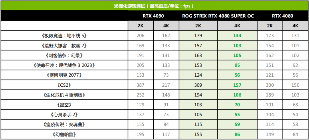 接下来我们进入实际的游戏测试,首先是光栅化游戏。在2K分辨率下,RTX 4080 SUPER的平均帧率相对RTX 4080提升了3%左右,可以达到RTX 4090约86%的性能。随着分辨率来到4K,领先幅度缩小到2%左右,达到RTX 4090约78%的性能。即使是在4K分辨率下,其平均游戏帧率都可以达到93fps以上,流畅运行3A游戏大作没有什么问题。