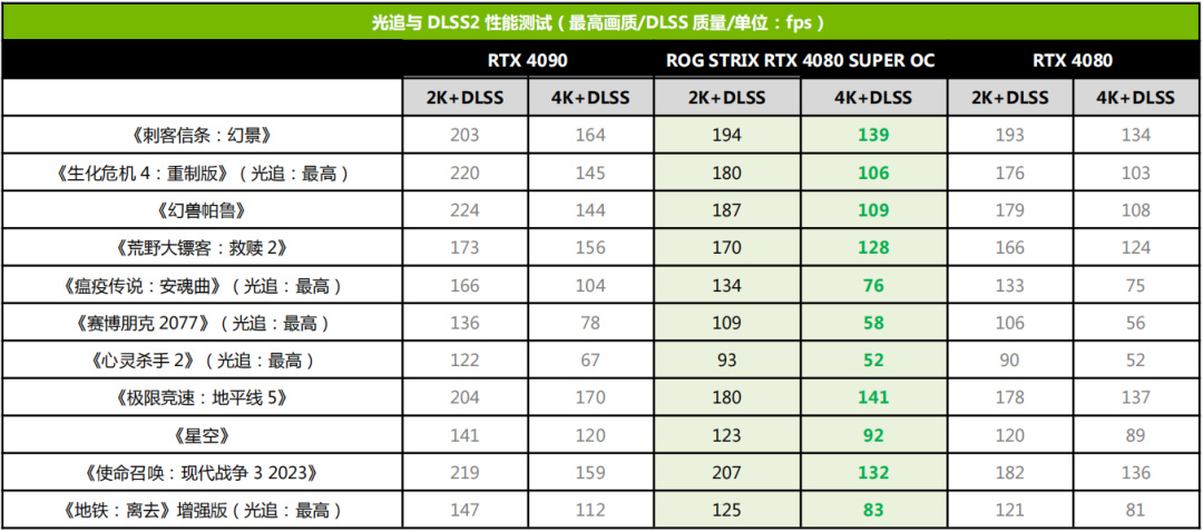 光追和DLSS 2游戏性能测试中的情况和光栅化游戏的表现类似,RTX 4080 SUPER在2K和4K分辨率下的平均帧率分别领先RTX 4080 3%和2%左右。2K分辨率下最高可以达到RTX 4090约98%的性能,4K分辨率下最高可以达到约85%的性能。从帧率上看,RTX 4080 SUPER可以在2K最高画质下,轻松实现平均150fps以上的电竞级帧率。而在4K分辨率最高画质下,其平均游戏帧率在100fps以上,即使是配置要求较高的《瘟疫传说:安魂曲》《地铁:离去》增强版也有76fps和83fps,体验非常流畅。
