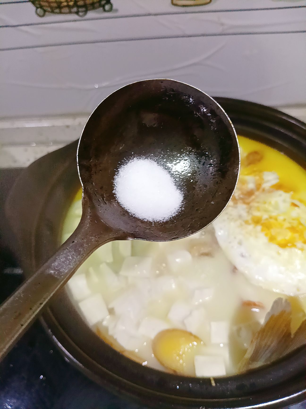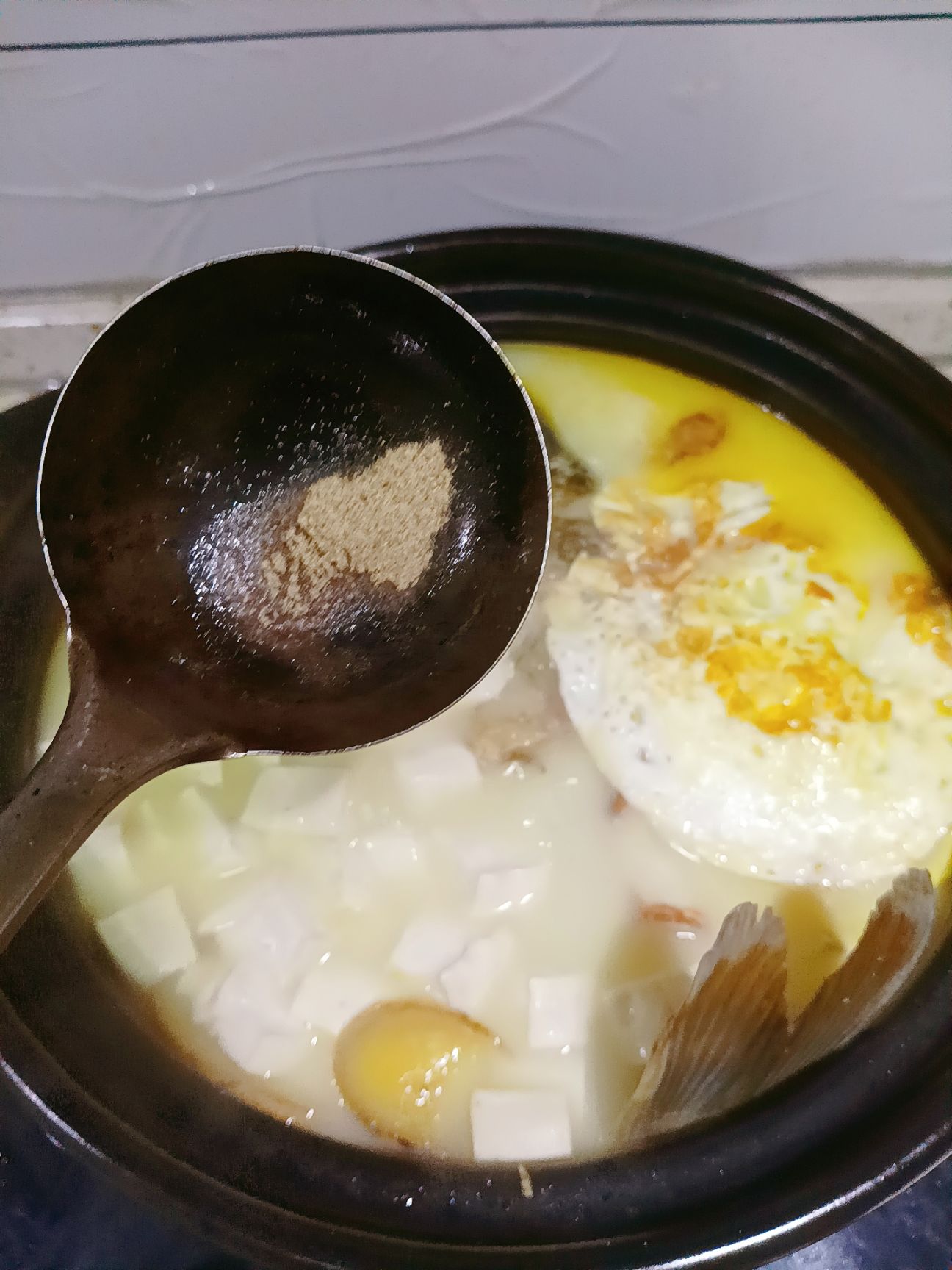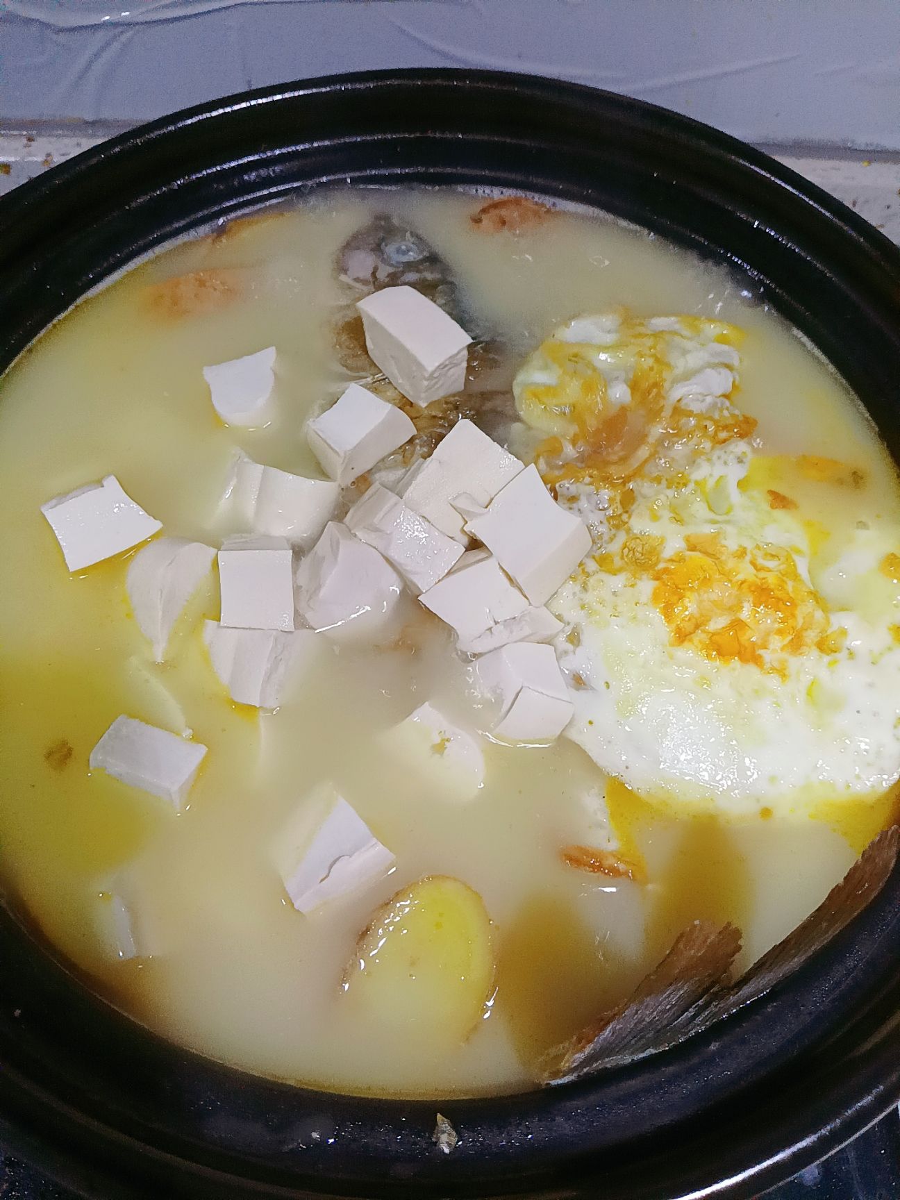 把煎好魚放進砂鍋,煎好雞蛋,放入蓋住食材的開水。大火煮開,轉小火,再放焯好豆腐。全程小火,煮15-20分鐘左右。