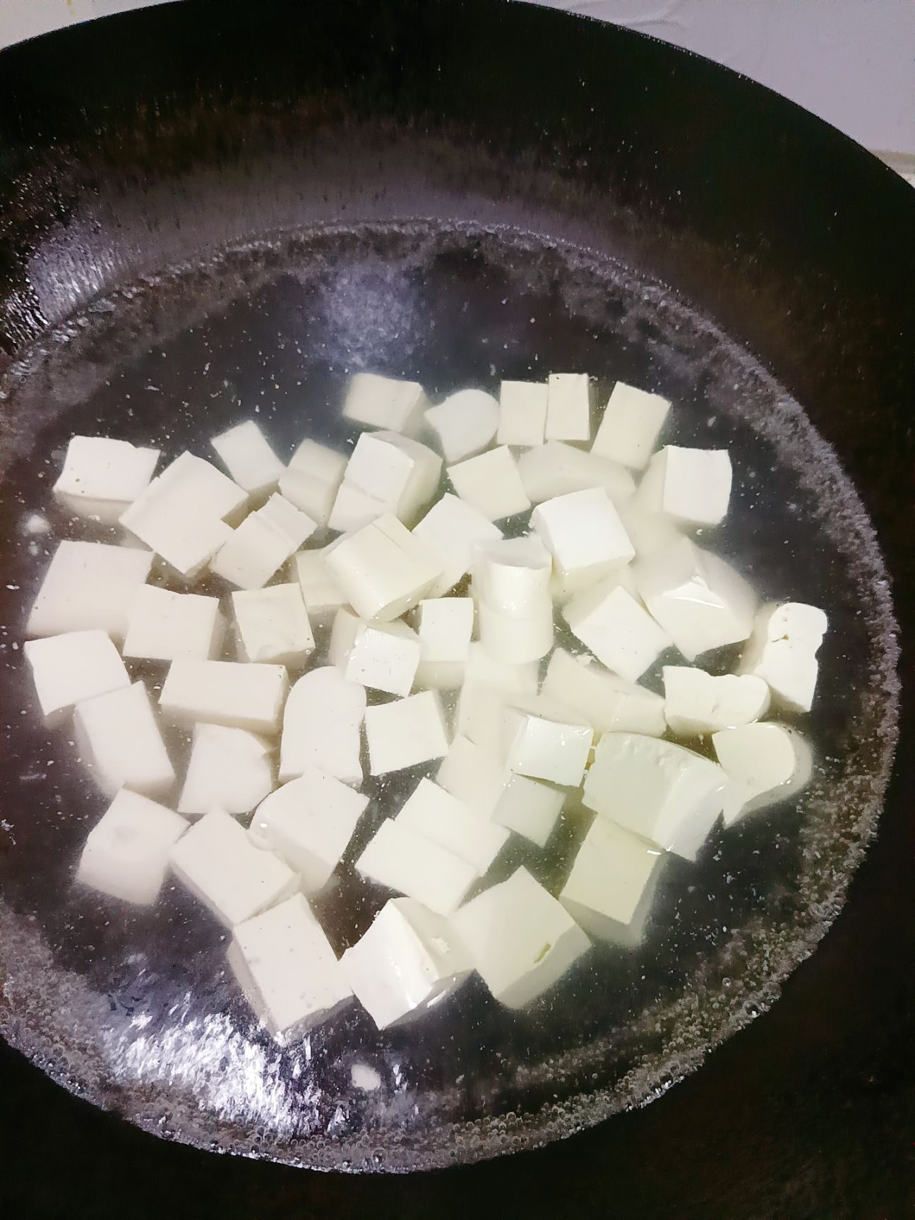 把豆腐切小塊,焯下水,去豆腥味,【我逗比老公給我買煎的豆腐,明明知道煮鯽魚豆腐湯】