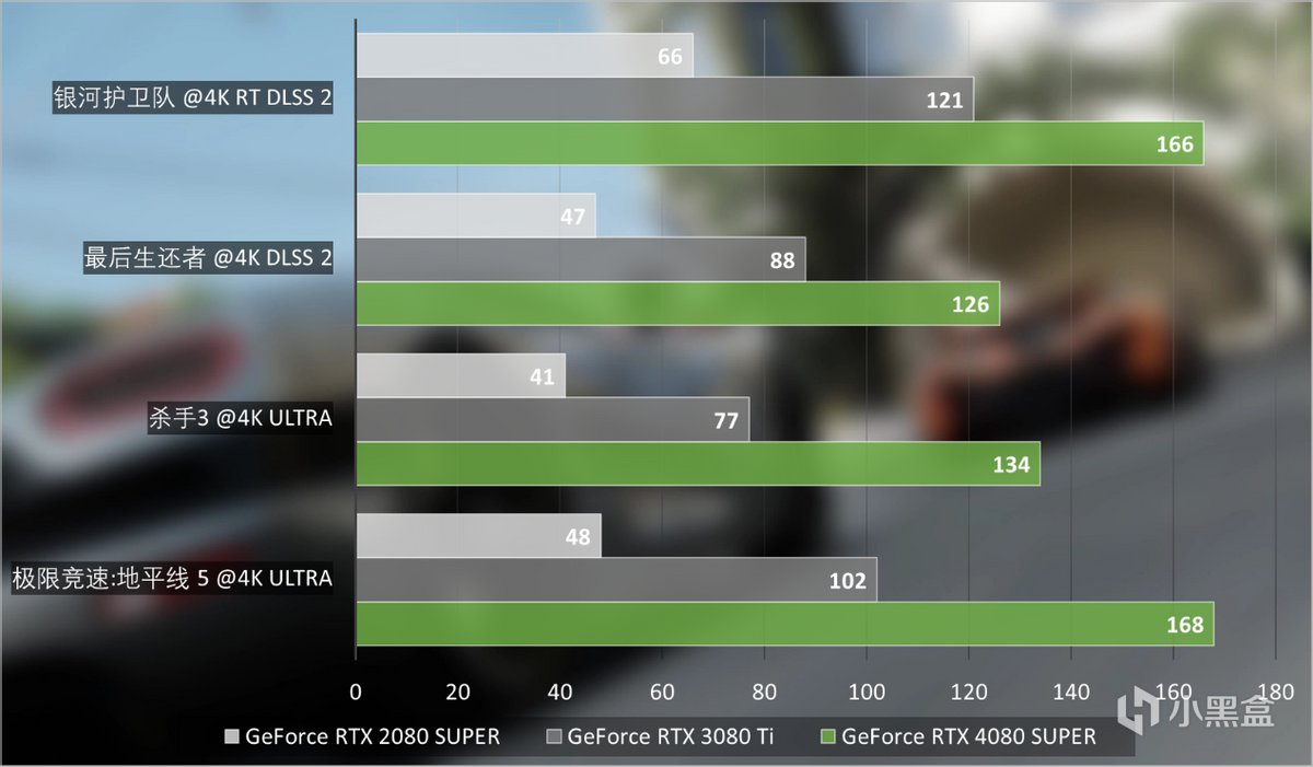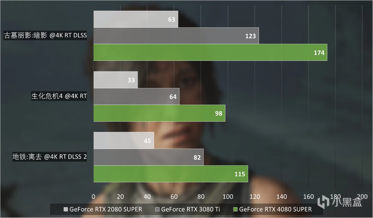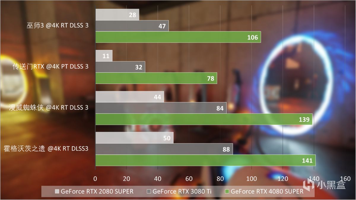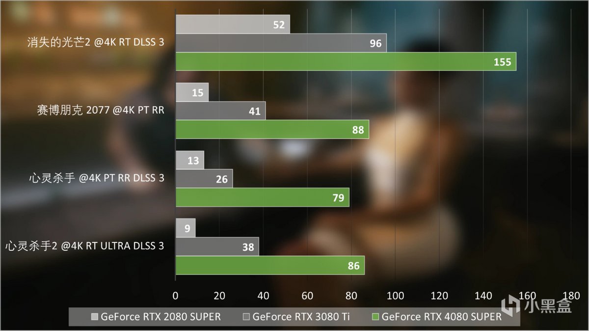 因此如果使用DLSS 2及以前的常规游戏,GeForce RTX 4080 SUPER在4K最高画质下,相对RTX 3080 Ti提升幅度起步45%,最高可达80%。而用GeForce RTX 4080 SUPER对比GeForce RTX 2080 SUPER,提升就相当夸张了,可以从150%到250%。