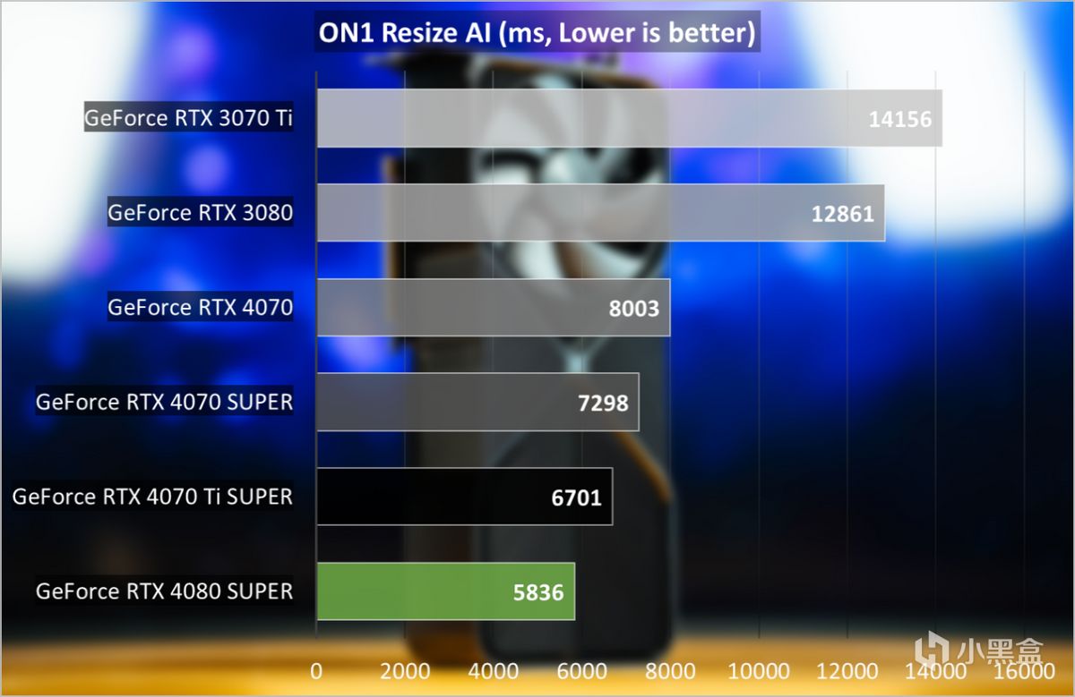 最后一项AI测试,则是利用ON1 Resize AI 2022对图片分辨率进行提升。可以看到GeForce RTX 4080 SUPER用最短的时间完成了照片的分辨率提升,相对RTX 3080节省了一半的时间。