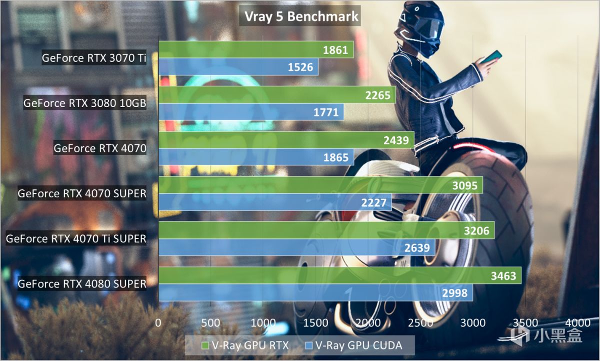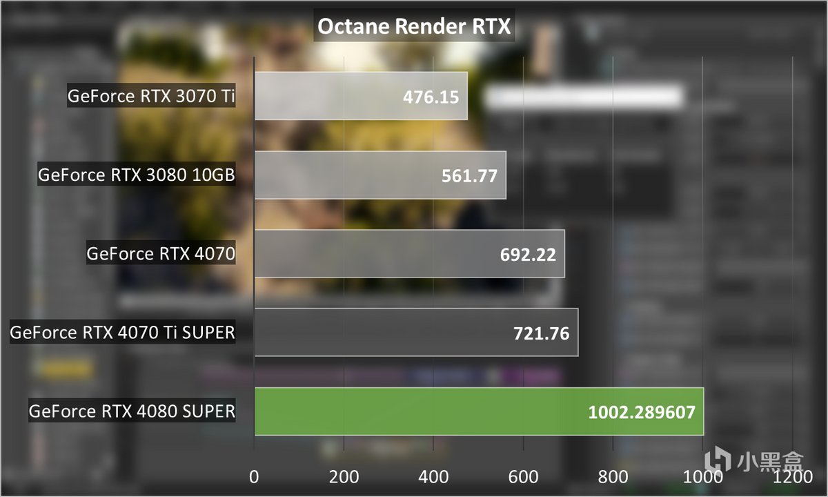另外一个Octane Render RTX则是用来测试GPU的光线追踪性能表现,在复杂场景下考验GPU每秒产生的样本率,提升幅度很高,GeForce RTX 4080 SUPER比RTX 3080提升了50%。