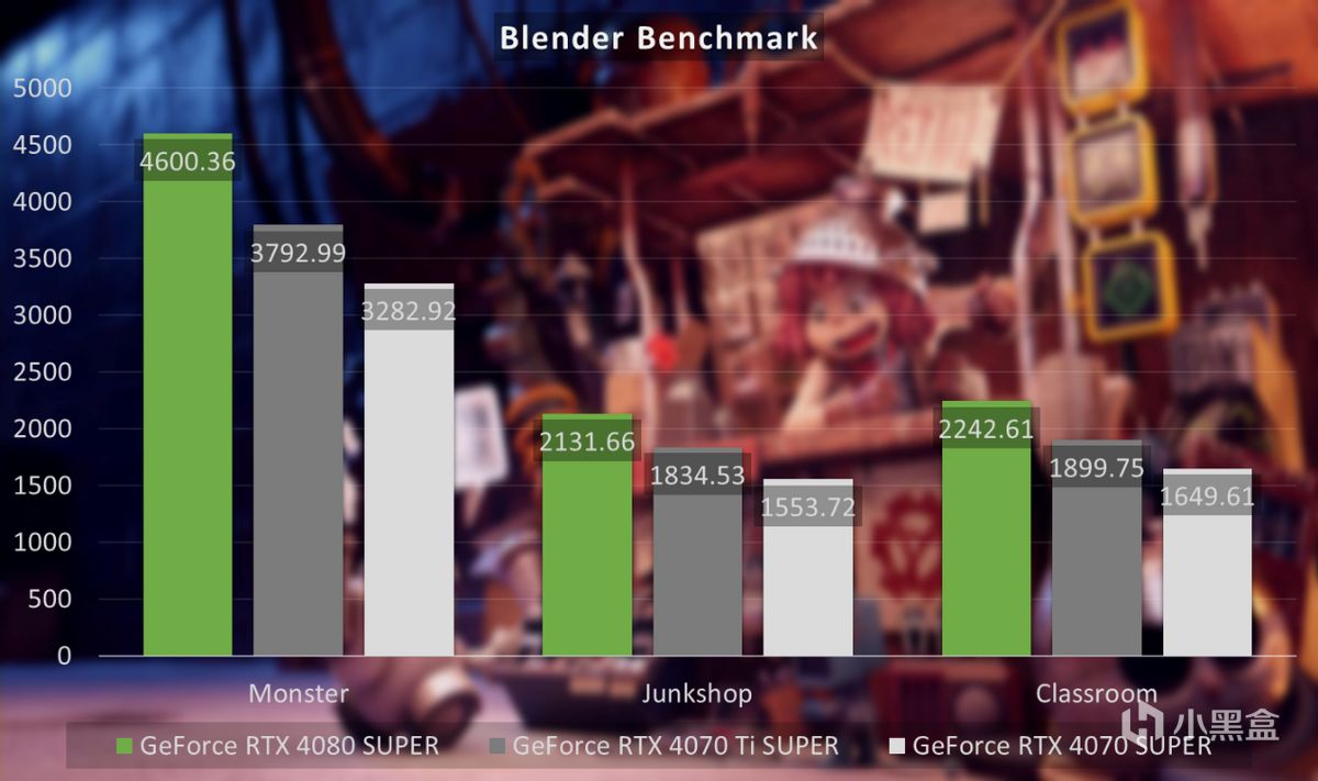 另外Blender Benchmark引入的Moster、Junkshop、Classroom三个参考场景,GeForce RTX 4080 SUPER相对RTX 3080提升最高超过80%。