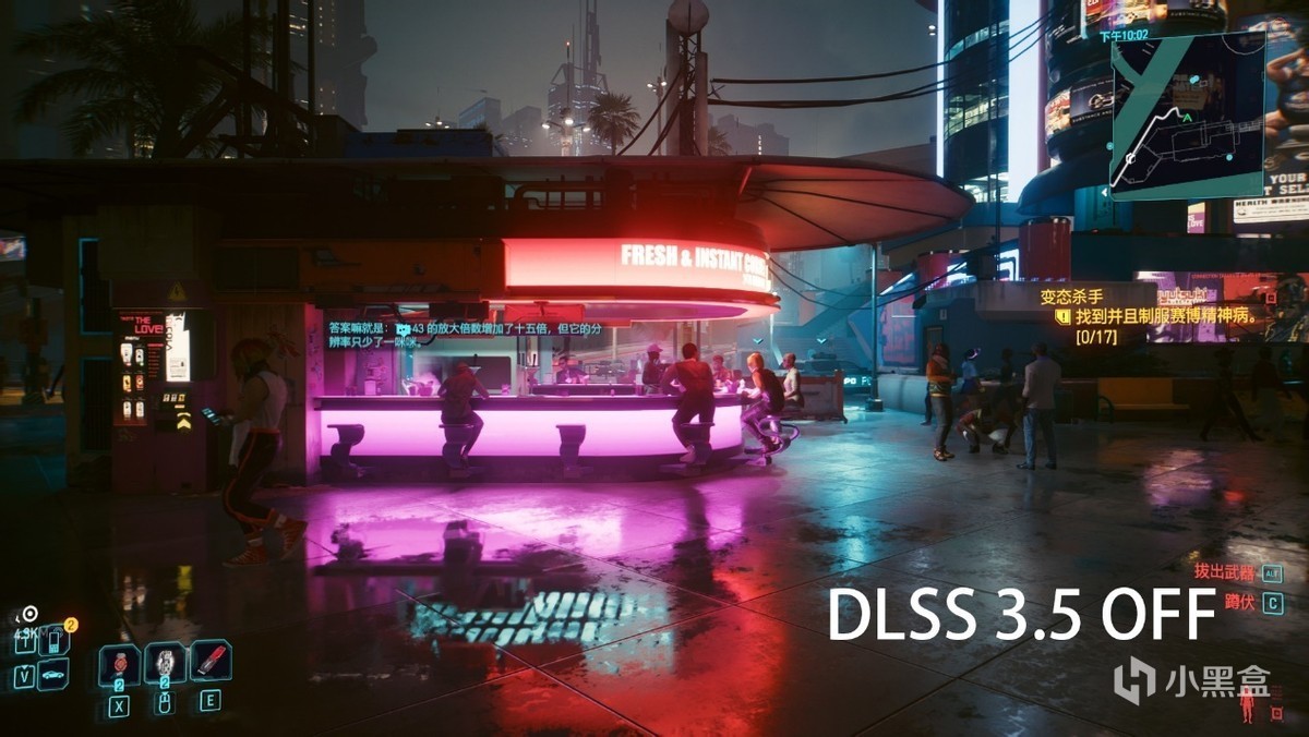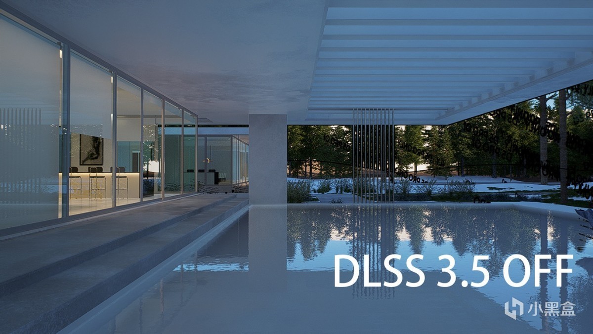 不仅如此,DLSS 3.5的加入还让场景发生了质变。当DLSS 3.5关闭后,地面的反光变得非常粗糙,左侧的玻璃也丧失了折射效果与通透性,同时帧率也降低到了不到原来的一半。