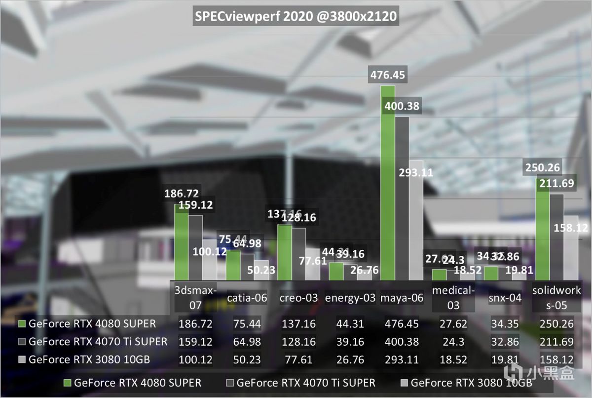 在专业软件创作环节,我们引用了SPECviewperf 2020作为参考,这是一款专门考验OpenGL和Direct X API下运行的系统的3D图形性能,软件包括3dsmax、Catia、Creo、Energy、Maya、Medical、SNX、Solidworks。GeForce RTX 4080 SUPER能够做到相对RTX 3080在专业应用领域,从50%到将近90%的帧率提升。