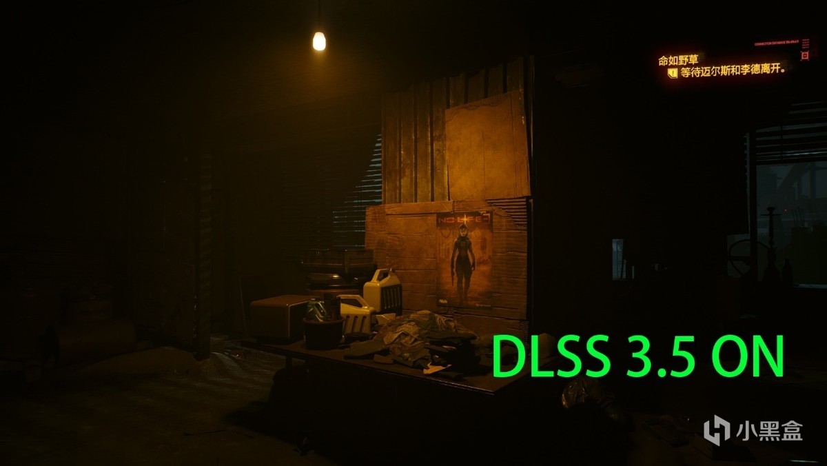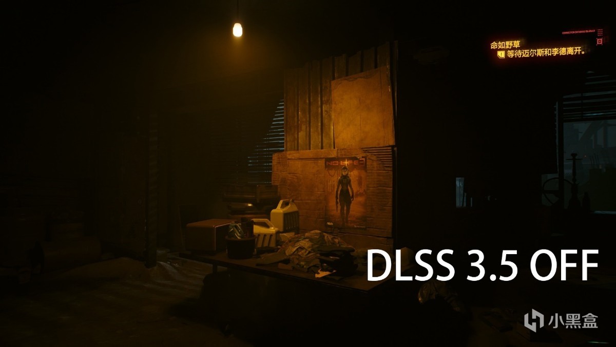 这里我们用开启DLSS 3.5的《赛博朋克2077》进行画质对比,可以看到在DLSS 3.5光线重建加持下湿漉的倒影变得清晰自然,同时物体边缘在暗影中仍然会提现出光反射效果,重点这是在获得更高帧率前提下实现的。