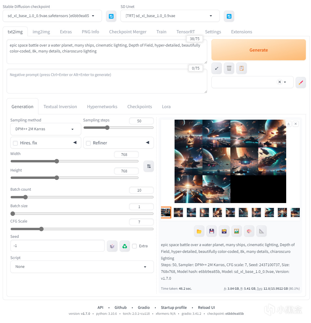 这里选择的Stable Diffusion XL在模型体量上相当Stable Diffusion 1.5扩大了3倍,从而导致计算的数据量提升,但也带来了更好的画质。这里以Stable Diffusion Web UI + TensorRT进行配置,用更短的语言描述生成10张分辨率为768x768的星际航行图片,每次运算1张图片,即总共执行10次,采样步数设置为50。