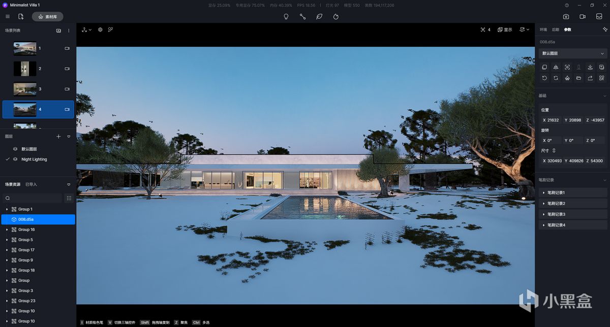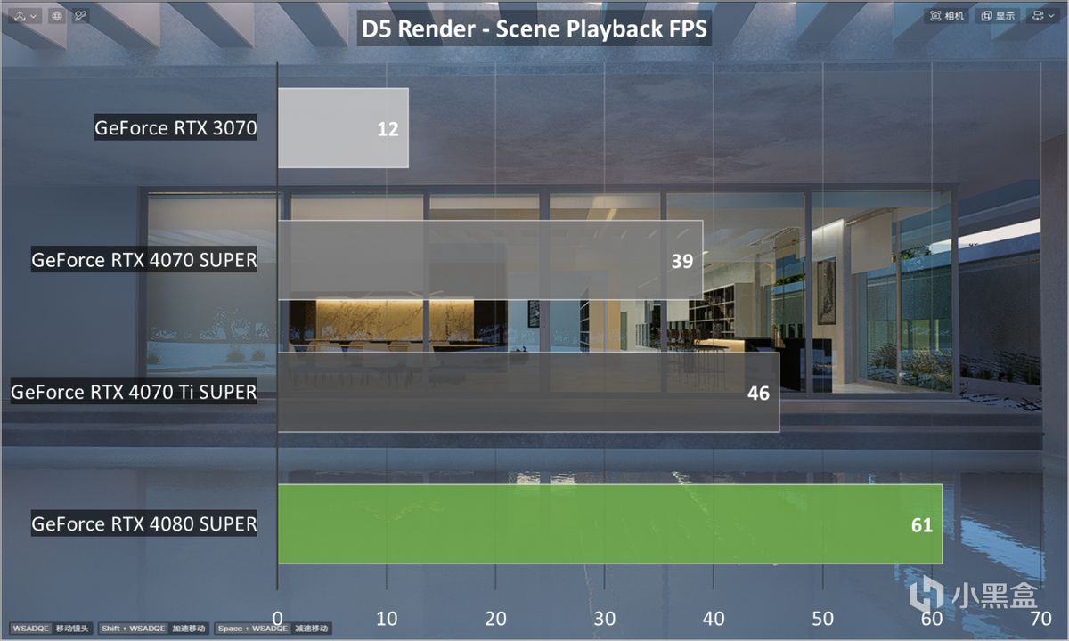 实际测试的Minimalist Villa 1场景中,GeForce RTX 4080 SUPER一下子让D5渲染器的运行程度变得极为流畅,轻松超过了60FPS的流畅度,就算相比一周前的RTX 4070 Ti SUPER也提升了35%以上。