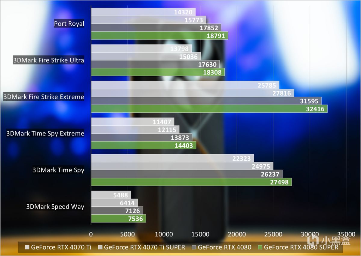 在基础性能测试中,主要参考检测DirectX 11和DirectX 12性能的3DMark Time Spy,3DMark Time Spy Extreme,3DMark Fire Strike Extreme,3DMark Fire Strike Ultra,Port Royal。可以看到GeForce RTX 4080 SUPER比RTX 4070 Ti SUPER提升有20%左右,而如果对比上一代的RTX 3080,提升幅度最高70%。