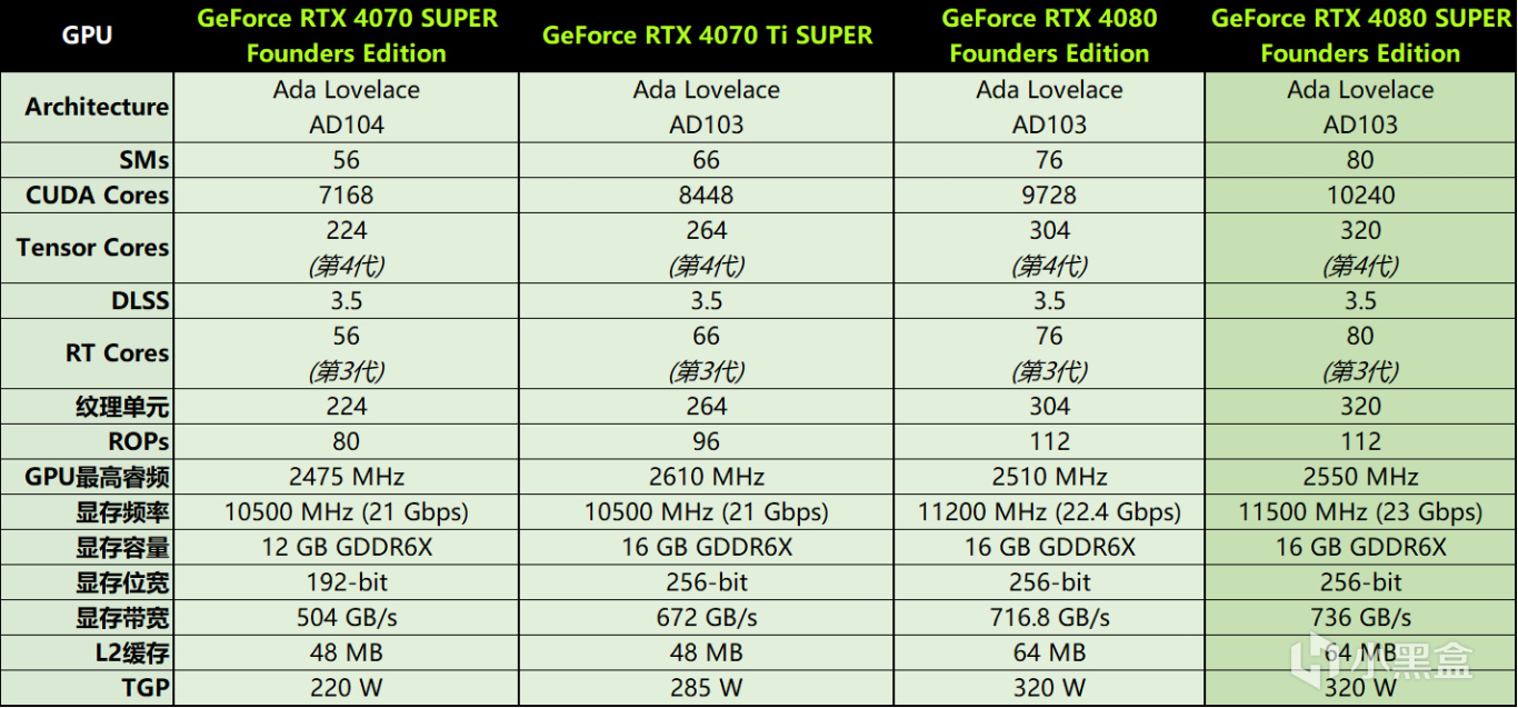至此,CES2024上发布的三款GeForce RTX SUPER发布完毕,这里不妨让我们用RTX 4080做对比,大致规格对比如下。