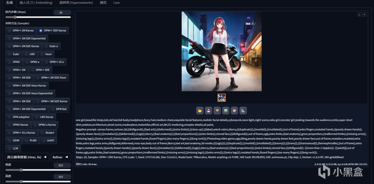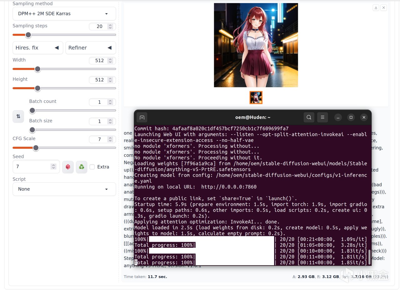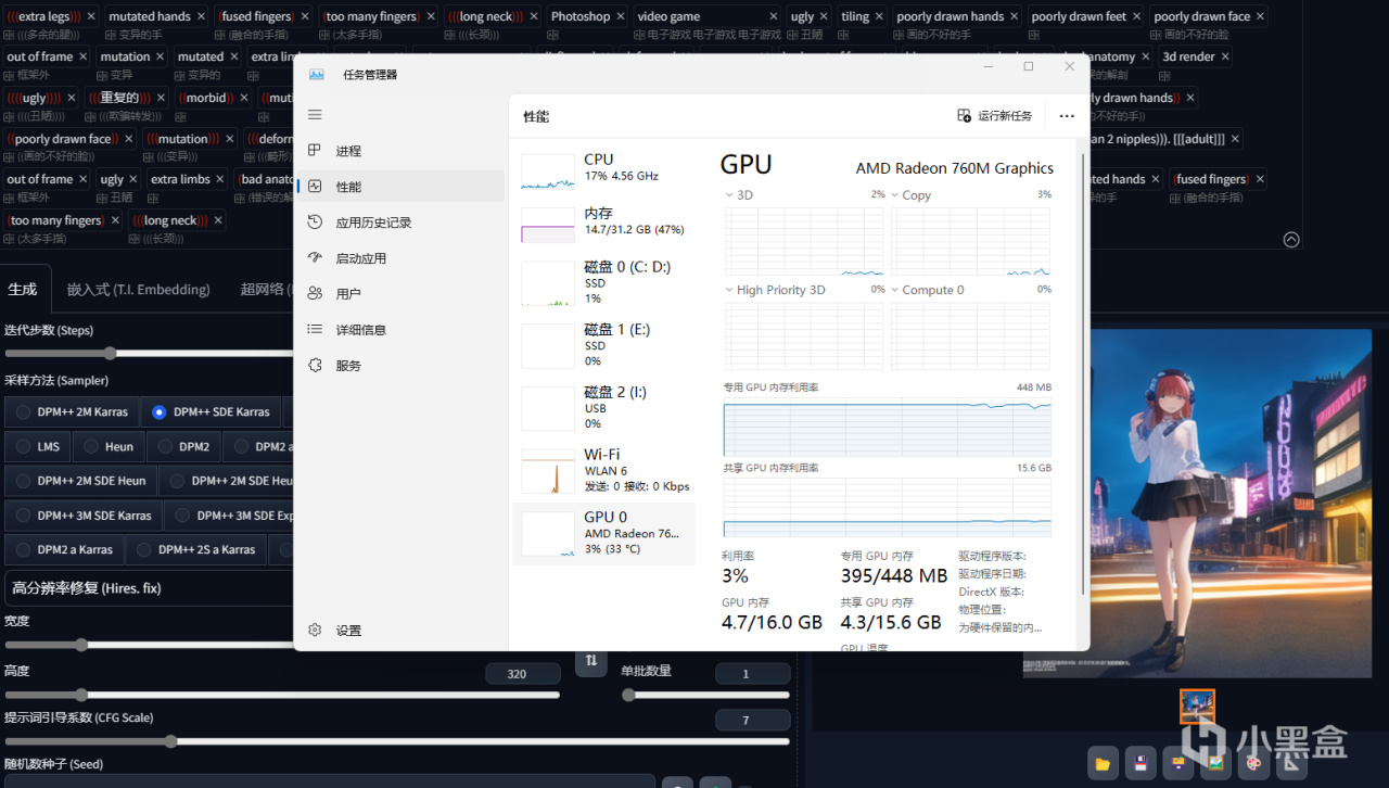 首先测试的是这块APU的ai能力,毕竟Ryzen AI也是这一代APU的一大特点嘛。使用windows下的DirectML模式就能使用Stable Diffusion进行推理,512x512的图像20轮迭代,从速度来看应该是有12it/min的,这个速度比CPU直接跑来说是快很多的,也能超过一般的核显不少,但可能还不够明显