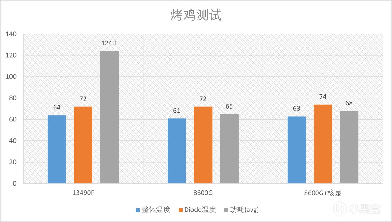 不过从烤鸡测试来看,8600G反而具有一些优势。使用默认boost策略,九州风神AK500s散热,一样的硅脂和室温,8600G即使多加了一个核显,最终烤鸡温度和功耗都低于13490F,4nm制程优势确实非常明显。还有一点非常重要的是,amd的tdp一直都标的很老实,tdp65W那就是65W,即使一开始boost会上90w(CPU+核显),最后还是回稳定在65W这样,但是13490F可以说是给阳光就灿烂的典型,从始至终就没跑过基础TDP65w
