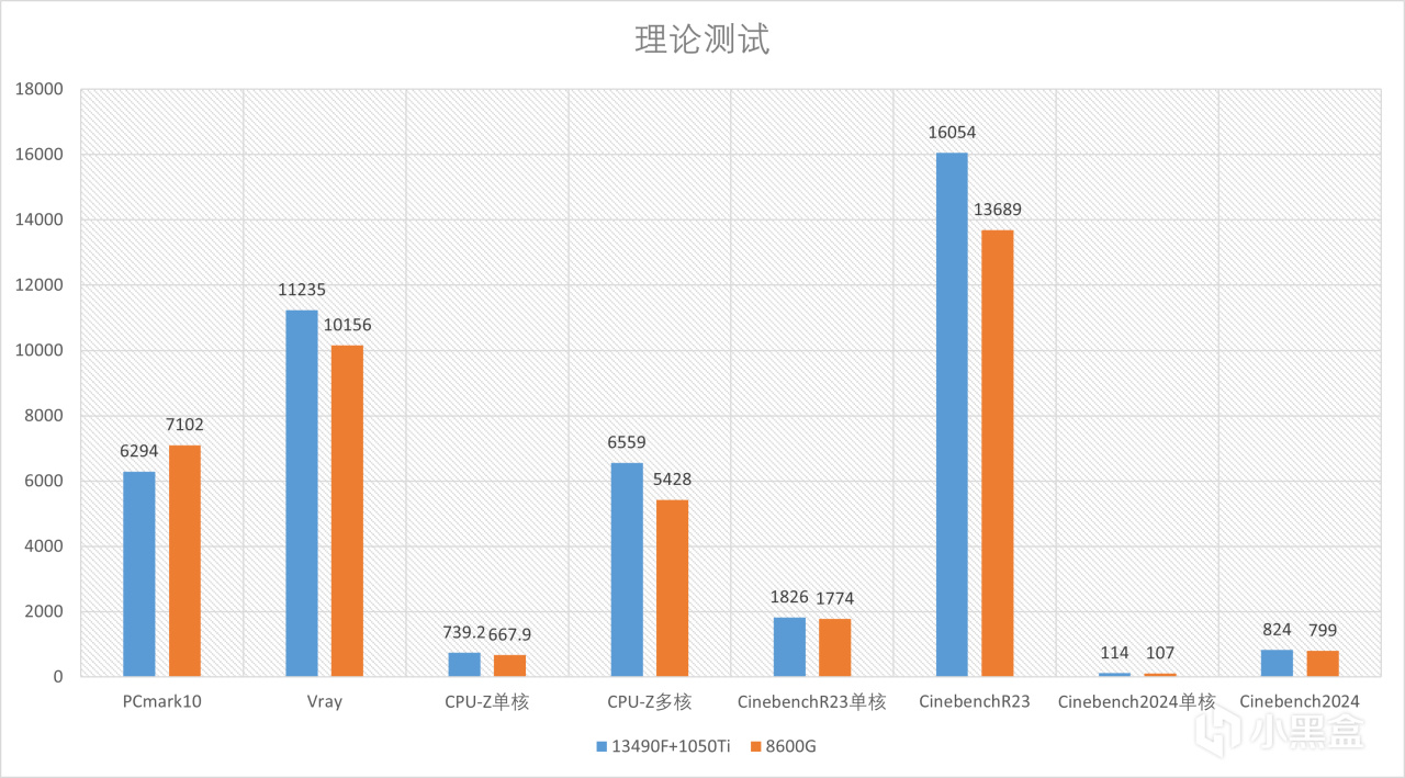 下面是一个理论测试,对比的是目前装机挺多的13490F,在CPU多核性能上8600G并没有落后多少,基本处于同一分段,完全达到了目前家用的性能水准,而这也主要是因为13490F多了一些E核,在单核性能上8600G核13490F是相差无几的