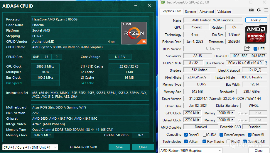 首先是CPU和GPU信息,从CPUID上可以看到8600G所使用的已经是4nm的工艺了,结合包装上的Zen4内核来看,单核性能应该不会差。8600G对内存的支持也是相当不错的,得益于主板和内存加成,测试中8600G是可以直接使用7200MHz的DDR5内存的。而显卡方面,760M虽然规格不及780M那么庞大,但也有8组cu,总共512个流处理器,已经超过了很多老旧的独显,显存频率依赖内存,而8600G对内存较好的支持给了760M表现的基础