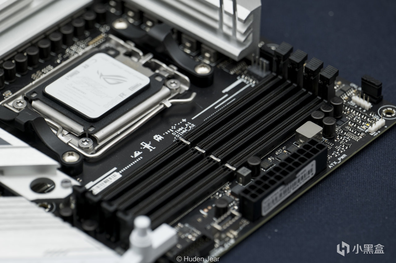 银色的供电散热非常精致,内存插槽使用DDR5内存,是经过强化的单边Qslot
