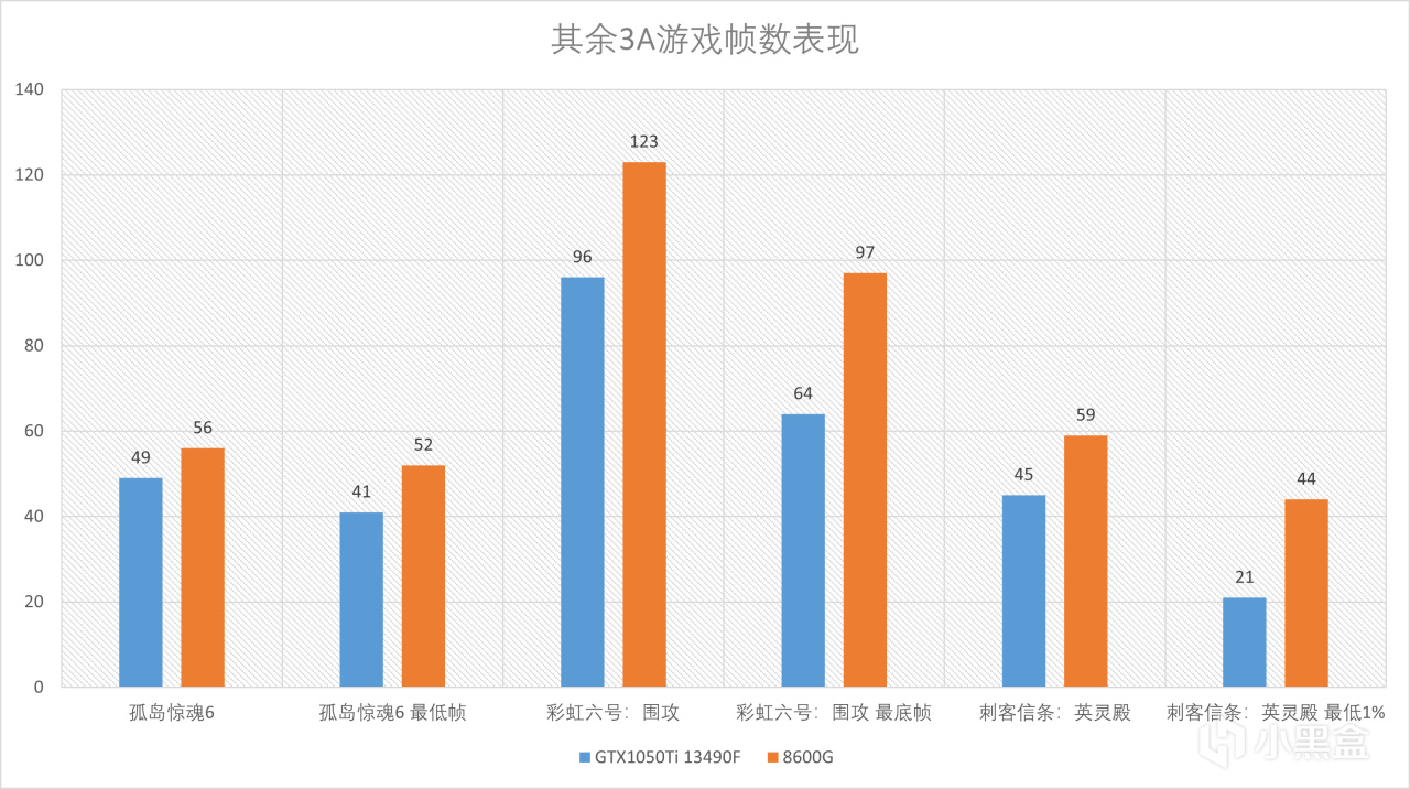 在其他的3A游戏表现上来看,8600G基本都保持了爆杀1050Ti的状态,这也基本宣告着低端独显已经被APU的一般核显给完全战胜,已经没有太多存在的必要了