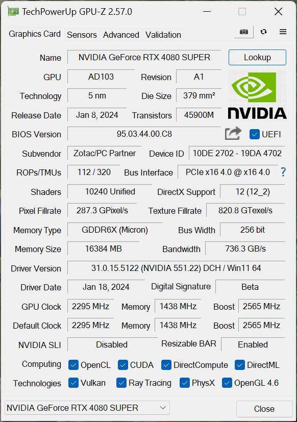 379平方毫米的芯片内,通过台积电4N工艺,封装了459亿个晶体管,难以想象这是人类科技。显卡拥有10240个流处理器,位宽256bit,最高Boost频率2.56GHz。