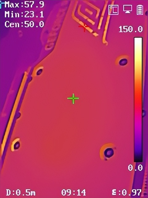 通过海康威视的H10热成像仪观察,显卡热量在背板上呈现较为均匀的分布,并未出现热量聚集,显示了散热总成的较高效能。