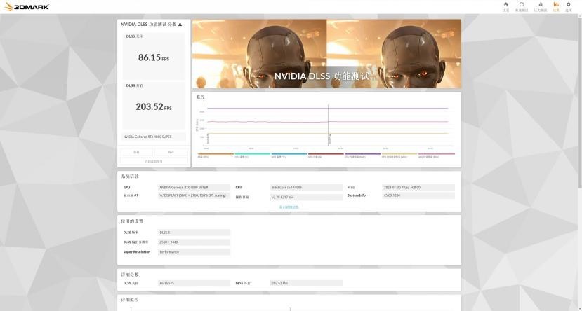 3DMark也专门设置了一个DLSS基准测试,在该测试中RTX 4080 SUPER使用DLSS 3,开启前帧数86,开启后203,提升幅度高达236%,超过3080 Ti在同分辨率下的提升倍数(216%)。