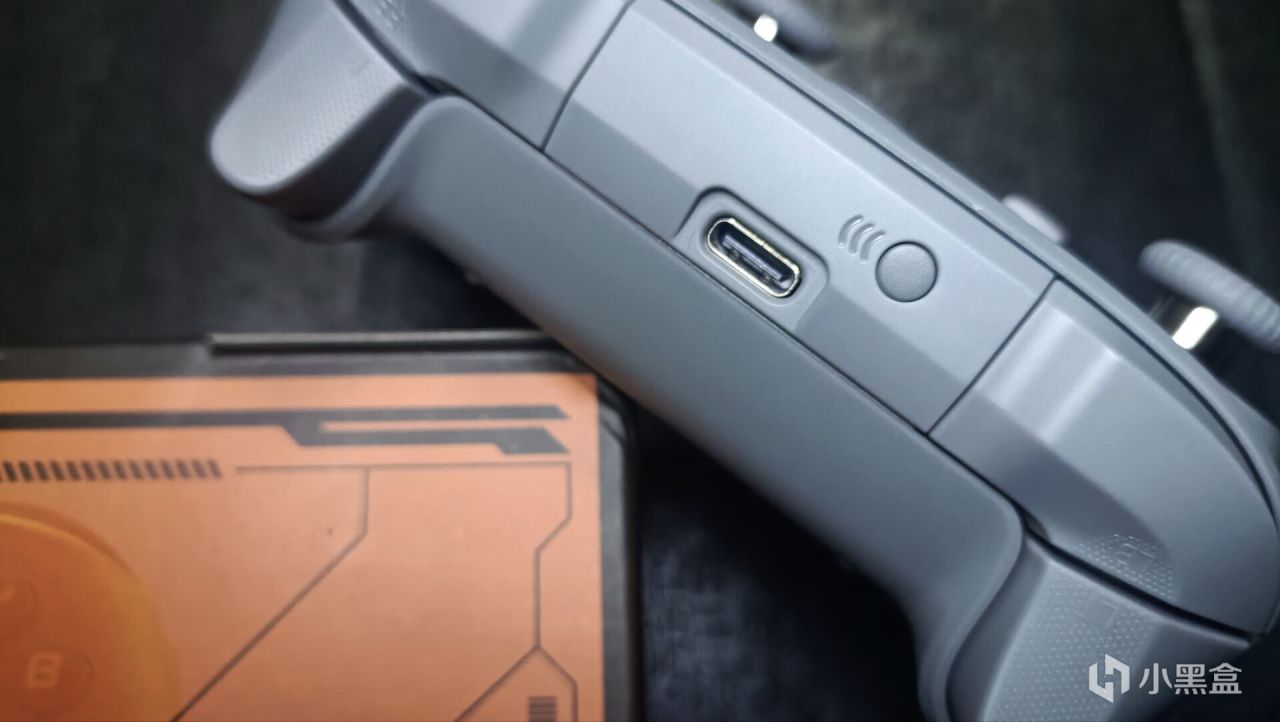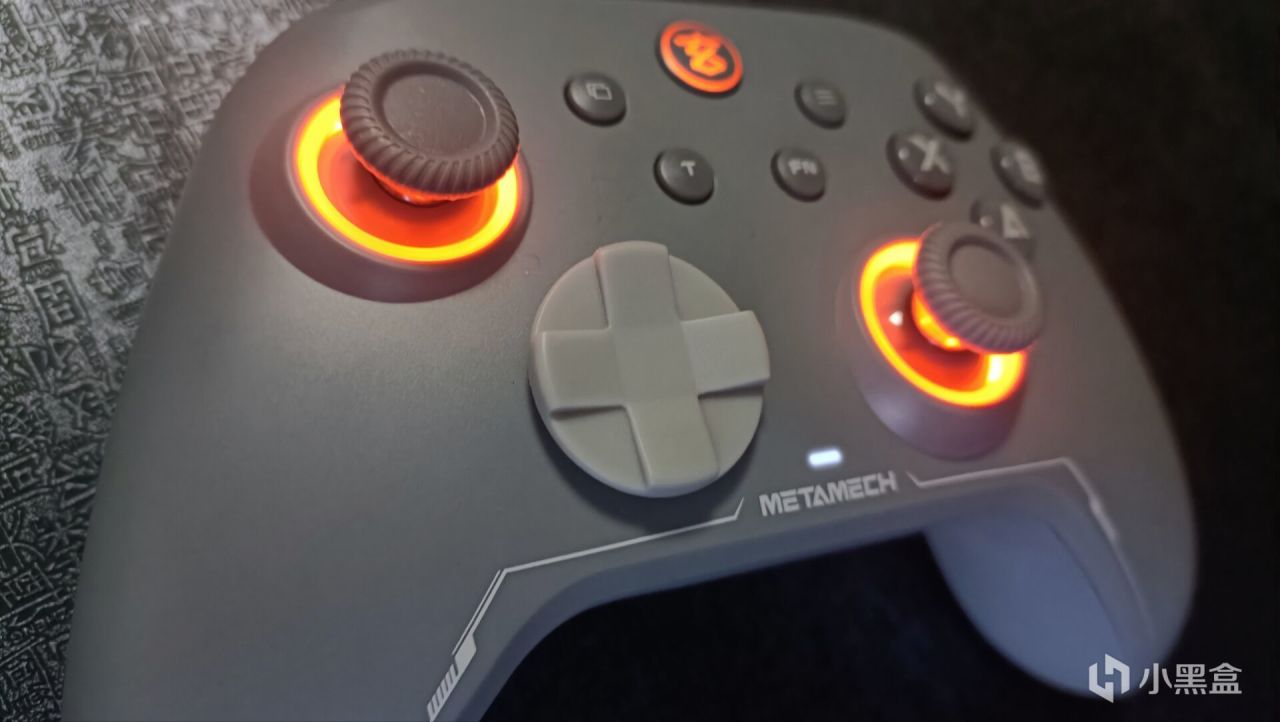 手柄的摇杆采用了控银霍尔摇杆JH16,并且搭配了金属环,提高了使用寿命的同时也不会产生飘逸现象,而在摇杆周围则有一圈POM环,在配对使用时会发出橙色的单色光,连接使用时科技感满满,帅就一个字。
