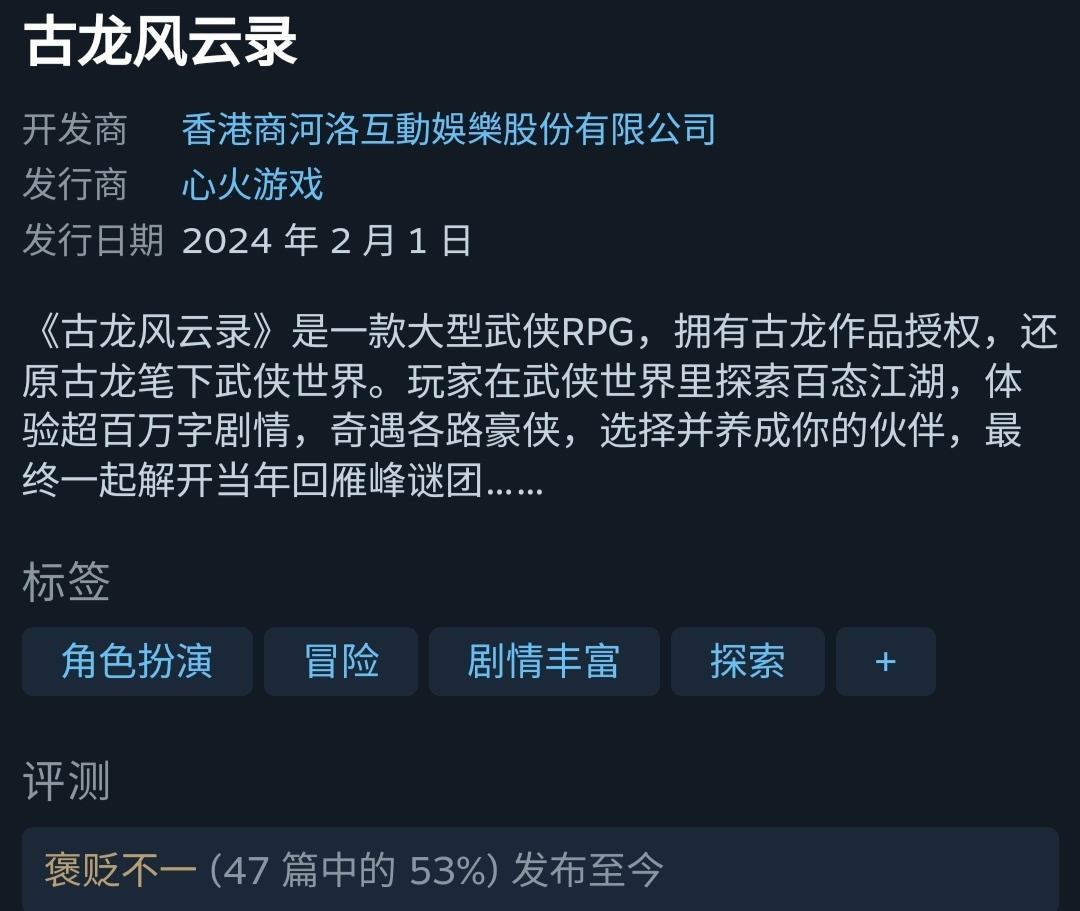 古龙风云录目前47条评测53%好评,褒贬不一,差评原因是多方面都令玩家不满意