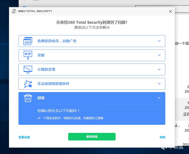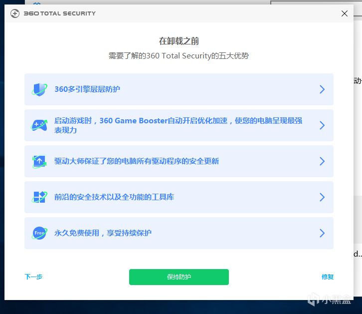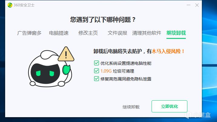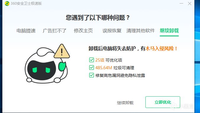 談完哪些,我們再來看看卸載它是不是意很困難的事情,我是用系統自帶的卸載功能,點擊卸載後360就開始了它的掙扎,途中有幾次不小心點錯了,沒卸載成,反而又進入到了360安全衛士界面。但是最後還是卸載乾淨了,這一點還是很好的。