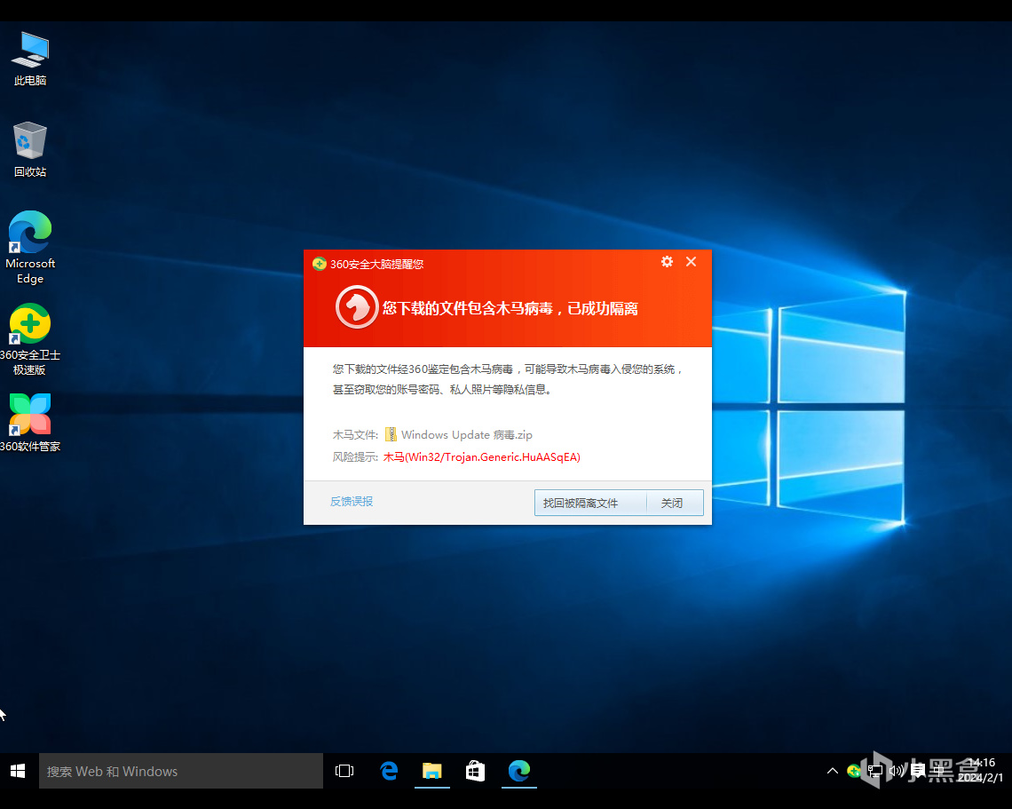 上面它說了,全面保護安全,我就從網上下載了一個帶有病毒的文件,它就立刻提示,並且把病毒放在了隔離區,反應速度那是沒得說。