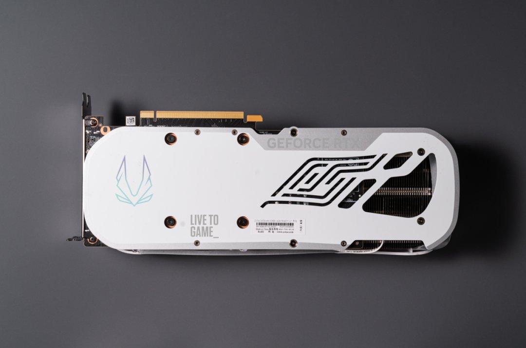 在背面索泰RTX 4080 SUPER 16GB TRINITY OC月白覆盖有高强度合金材料一体铸形合金背板,起到保护显卡PCB,提升显卡静电防护能力等作用。在尾部加入了开孔设计,便于风扇气流穿透鳍片和背板,实现更高效的散热。