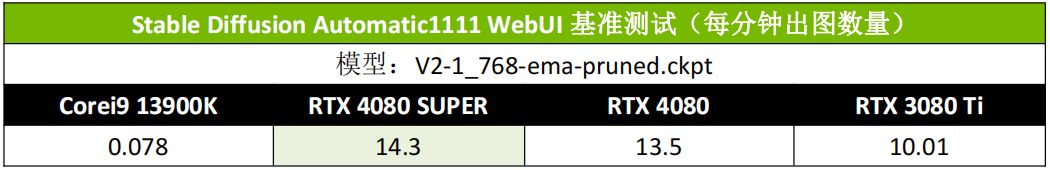 Stable Diffusion是当下最火的本地AI出图工具,NVIDIA GPU则是运行它最高效、兼容性最好的装备。Stable Diffusion的基准测试部分,我们使用了NVIDIA官方推荐的标准设置方便与之前的测试数据对比。采样方式为Euler a、采样步数为50、CFG Scale为7.5、每批次出图数为2、批次为10,最后统计每分钟出图数量。可以看到,索泰RTX 4080 SUPER 16GB TRINITY OC月白的出图速度大约比RTX 4080快了5%。