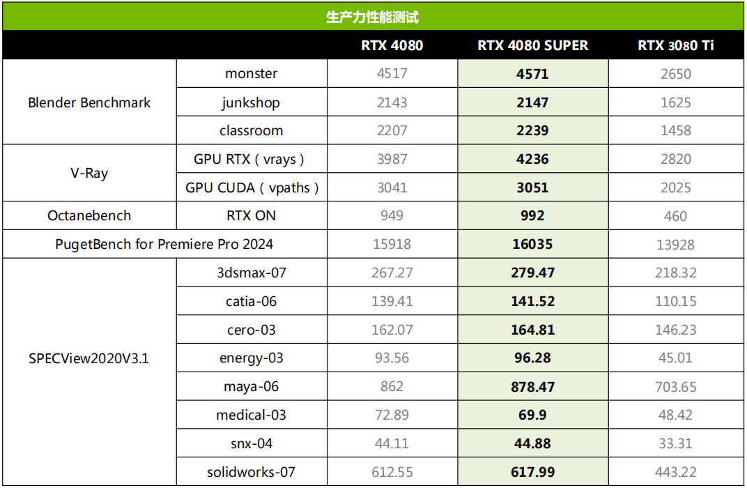 除了强悍的游戏性能之外,索泰RTX 4080 SUPER 16GB TRINITY OC月白的专业性能也不差。相对RTX 4080,在Blender、V-Ray和Octanebench这些3D渲染类测试中,渲染效率都得到了一定的提升。再考虑到CUDA与NVIDIA STUDIO生态圈在业界无可匹敌的地位,索泰RTX 4080 SUPER 16GB TRINITY OC月白确实非常值得设计师用户选择。