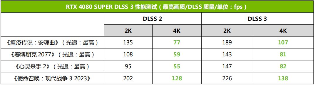 在开启DLSS 3之后,多款游戏的4K分辨率性能得到了大幅提升,原本在DLSS 2质量挡下不流畅的游戏,也将帧率提升到了80fps以上,实现了流畅的游戏画面。比如《瘟疫传说:安魂曲》的画面帧率从77fps提升到了107fps,提升幅度在38%以上;《赛博朋克2077》也从59fps提升到了81fps,提升幅度在37%;而《心灵杀手2》的画面平均帧率更是从55fps来到了82fps,实现了将近50%的性能提升,性能提升了不止一个档次。