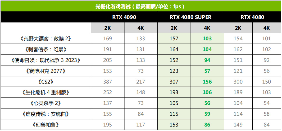 在2K分辨率下,这款索泰RTX 4080 SUPER 16GB TRINITY OC月白的性能表现堪称轻松自如。