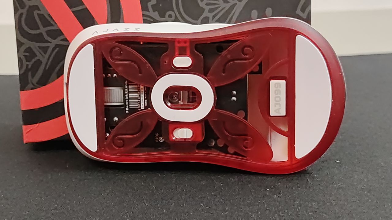 除此之外,AJ099的底部就是一些常规的配置了,电源开关,模式切换开关,2.4G收纳仓,该有的都有了脚贴也是条状纯ptfe脚贴,顺滑度没有任何问题