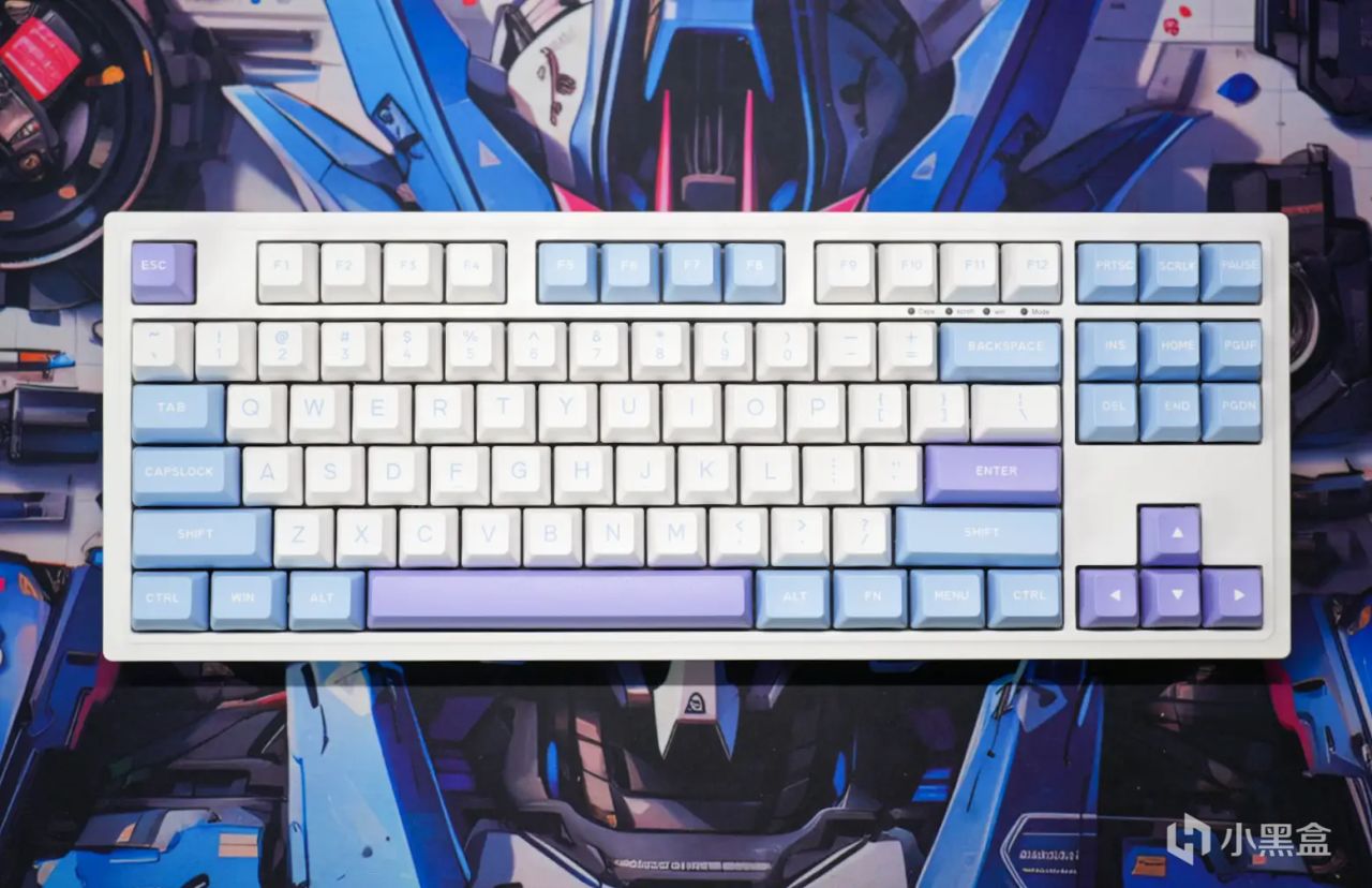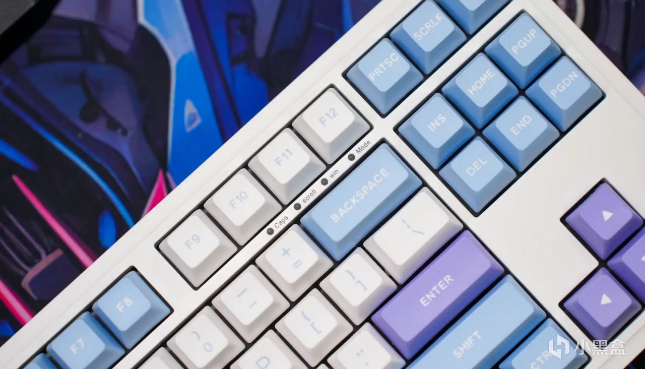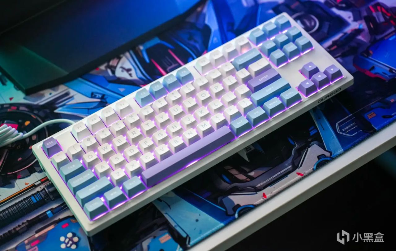 配色方面,杜伽K100冰莓配色采用的是撞色设计风格,整体采用了蓝、紫、白三种颜色,个人觉得无论是正途的布局还是调色都很不错,并且可以根据配色能迅速的区分出键盘的输入区与功能区。