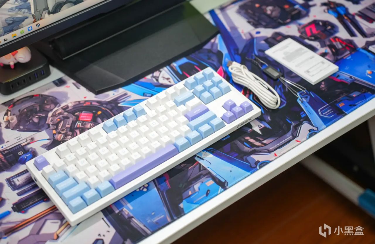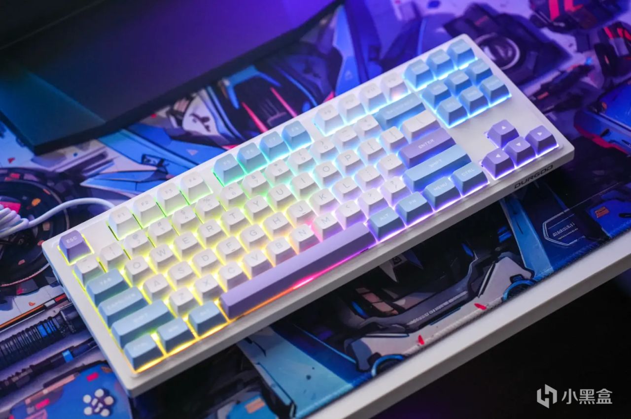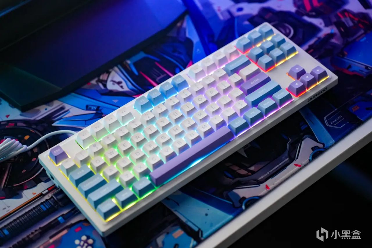 配色方面,杜伽K100冰莓配色采用的是撞色设计风格,整体采用了蓝、紫、白三种颜色,个人觉得无论是正途的布局还是调色都很不错,并且可以根据配色能迅速的区分出键盘的输入区与功能区。