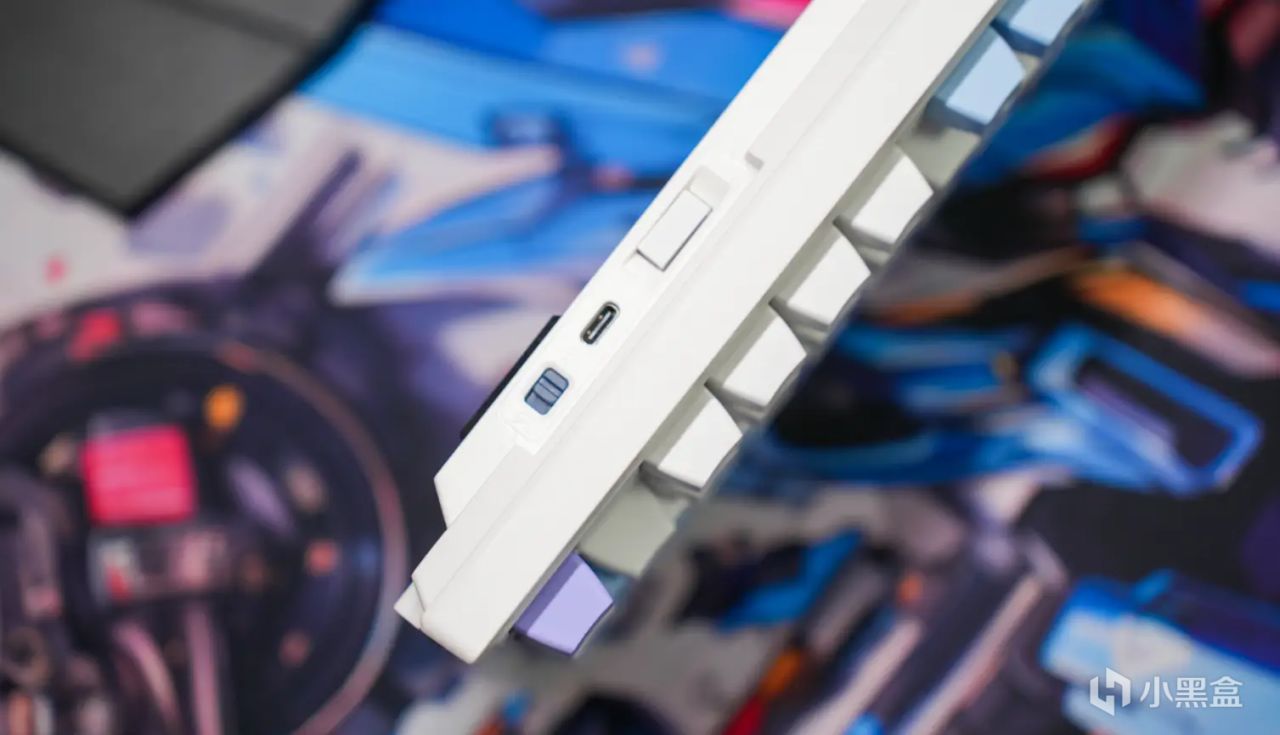至于键盘的开关键、Type-C接口以及2.4G无线接收器收纳仓都被集中设计在键盘的顶部侧面,只不过无论是开关还是2.4G无线接收器都需要借助指甲的力量,如果对于没有留指甲的小伙伴可能在开启键盘开关或者取出2.4G无线接收器时会有一点点困难。