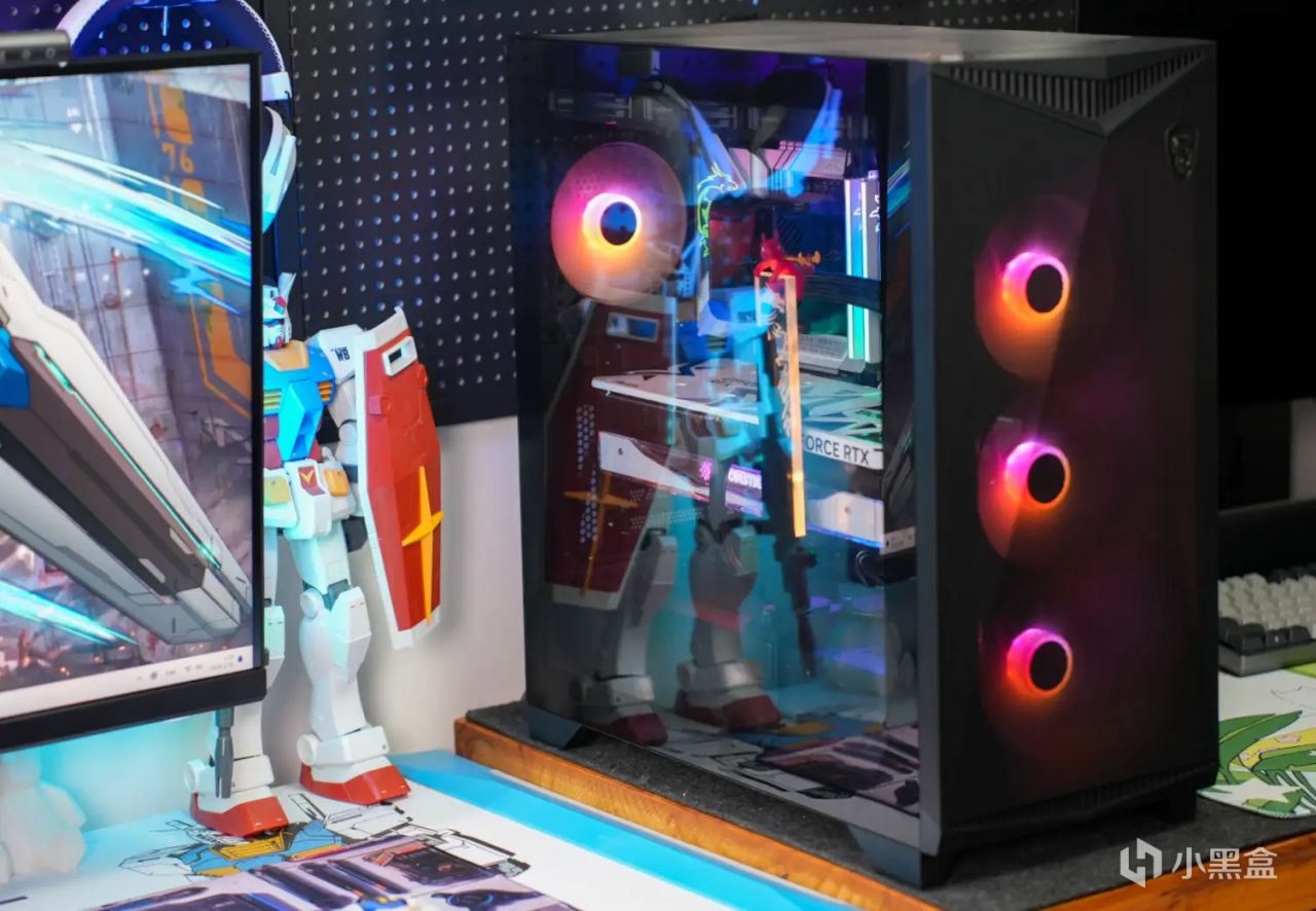 机箱方面选用的是微星氪金枪3,该机箱的非常注重散热,其前面板采用镂空设计的金属防尘网,预装了大尺寸的ARGB风扇设计。并且为了适配当下非常庞大的RTX40系显卡,内部还有一个支持ARGB灯效的显卡支架。非常值得喜欢光污染的小伙伴入手。