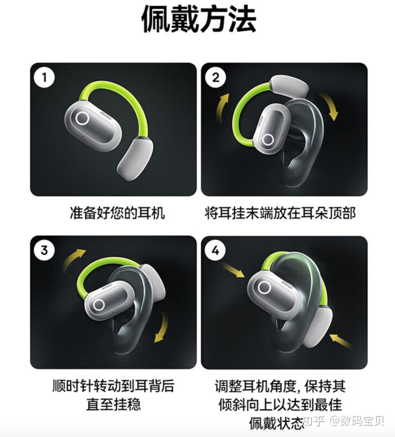 我用过不少的骨传导耳机,好多都是固定的模式 ,也就是说,100个脑袋用的耳机结构都是一样的,所以会 导致有的人戴耳机会出现松动,过紧这种感觉,而这个耳机外部采用的是亲肤的硅胶材质,内部采用的是钛合金记忆钢丝,一次 调教即可完美贴合耳部脑部的曲线,让佩戴者更加舒适,也能够更加放纵的去体验高难度动作而不掉耳机。佩戴方法如下: