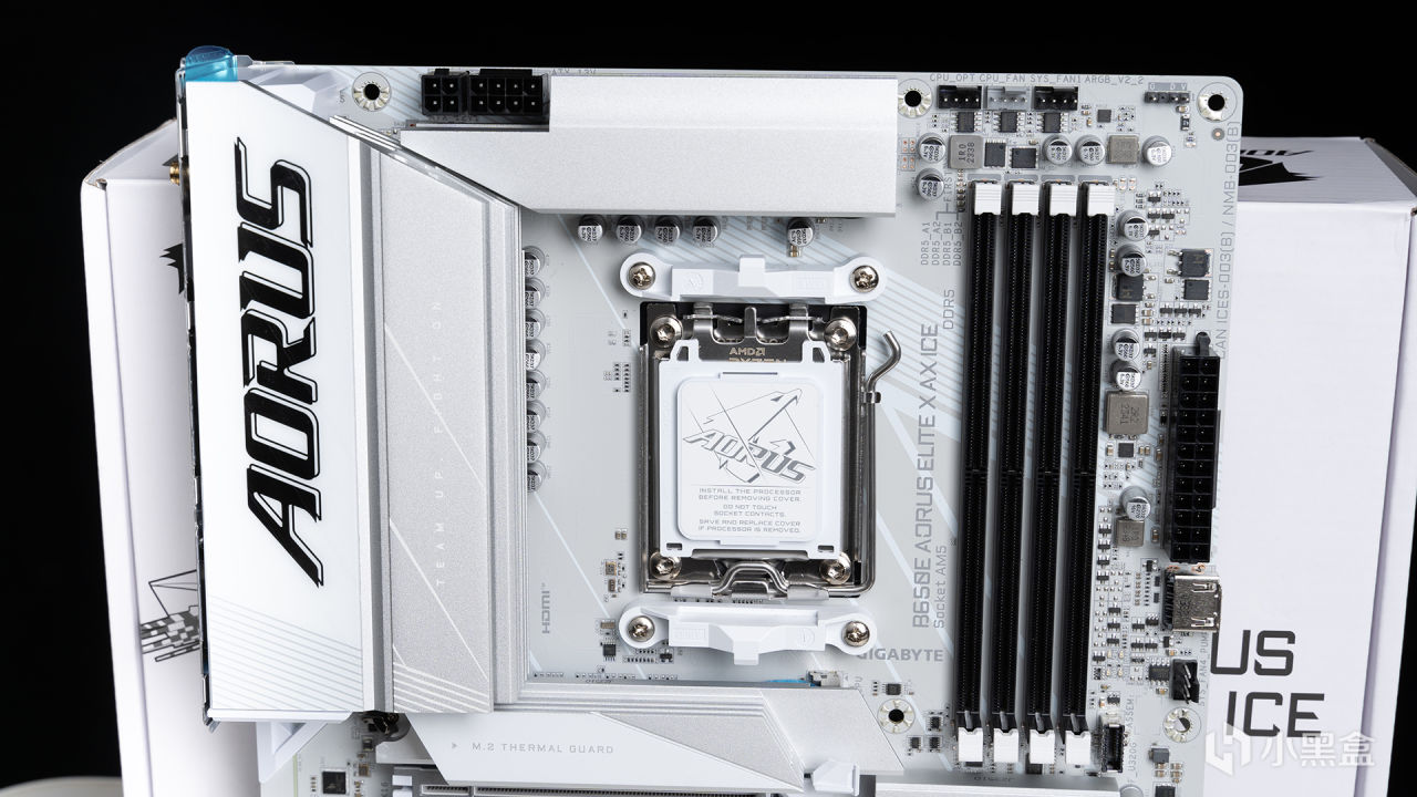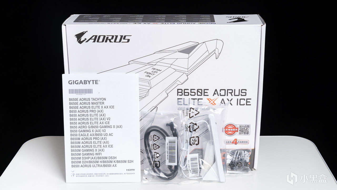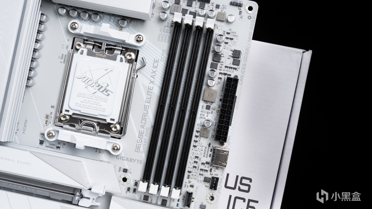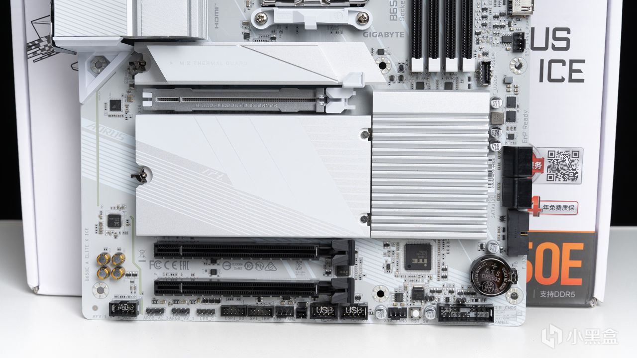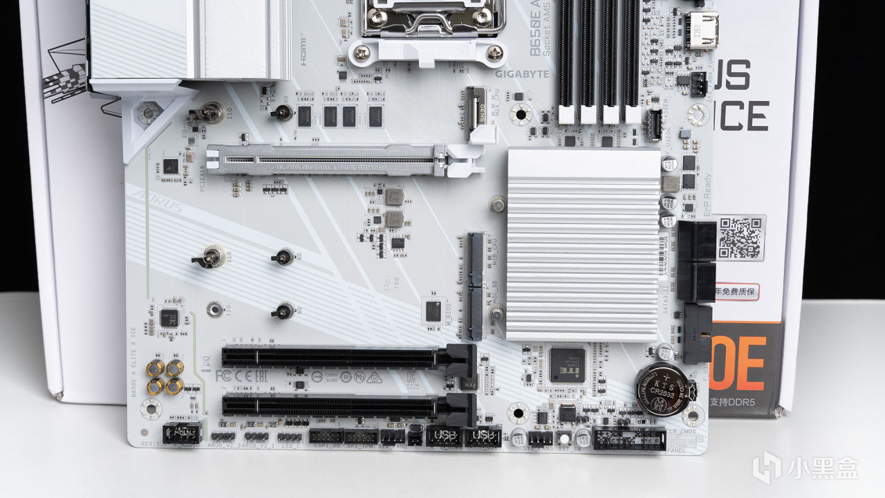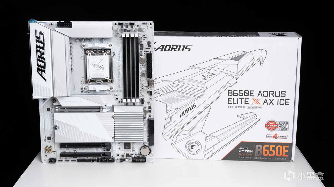 本次測試全程使用的主板是來自技嘉的B650E AORUS ELITE X AX ICE冰雕X(以下簡稱B650M冰雕X),包裝上註明了支持四年全國聯保,用起來無疑是更安心。B650E冰雕X第一眼看上去的感覺就是驚豔——白得徹底,從散熱裝甲再到PCB都是相同的純淨格調,絕對是各位純白裝機的首選,要知道本來AMD的白色主板就是幾乎沒有的。