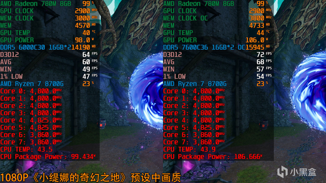 銳龍7 8700G(Radeon 780M)+DDR5 7600C36 1:2平均幀數68fps,相比前者提升13.3%