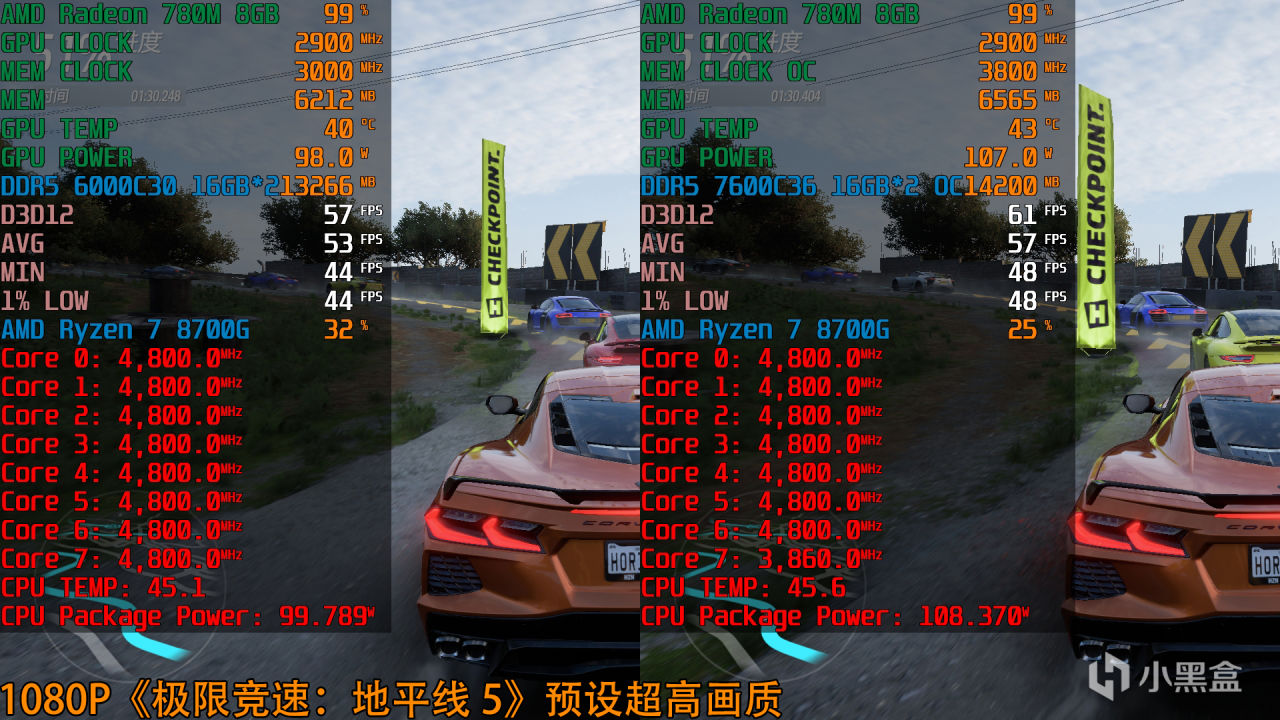 銳龍7 8700G(Radeon 780M)+DDR5 7600C36 1:2平均幀數57fps,相比前者提升7.5%