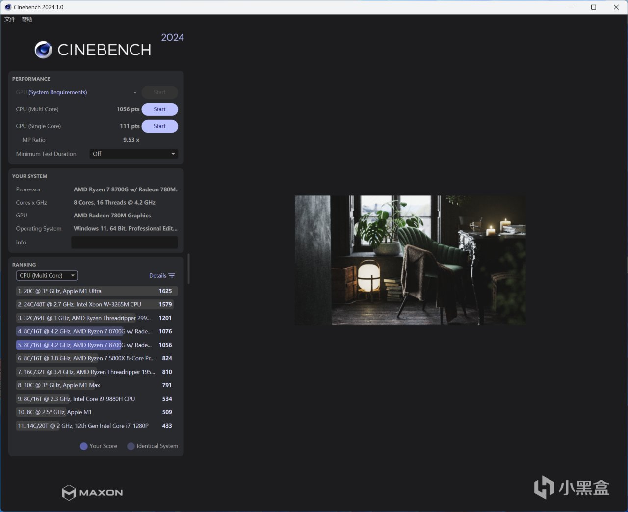 CINEBENCH 2024基準測試關於生產力性能最好的標杆跑分軟件,2024版本對於內存方面也有一定要求了,而且測試項目更貼近真實生產力表現。這個項目銳龍7 8700G單核得分111 pts,多核得分1039 pts,雖然閹割了緩存,但是分數會比較接近銳龍7 7700,純大核規格還是靠譜!