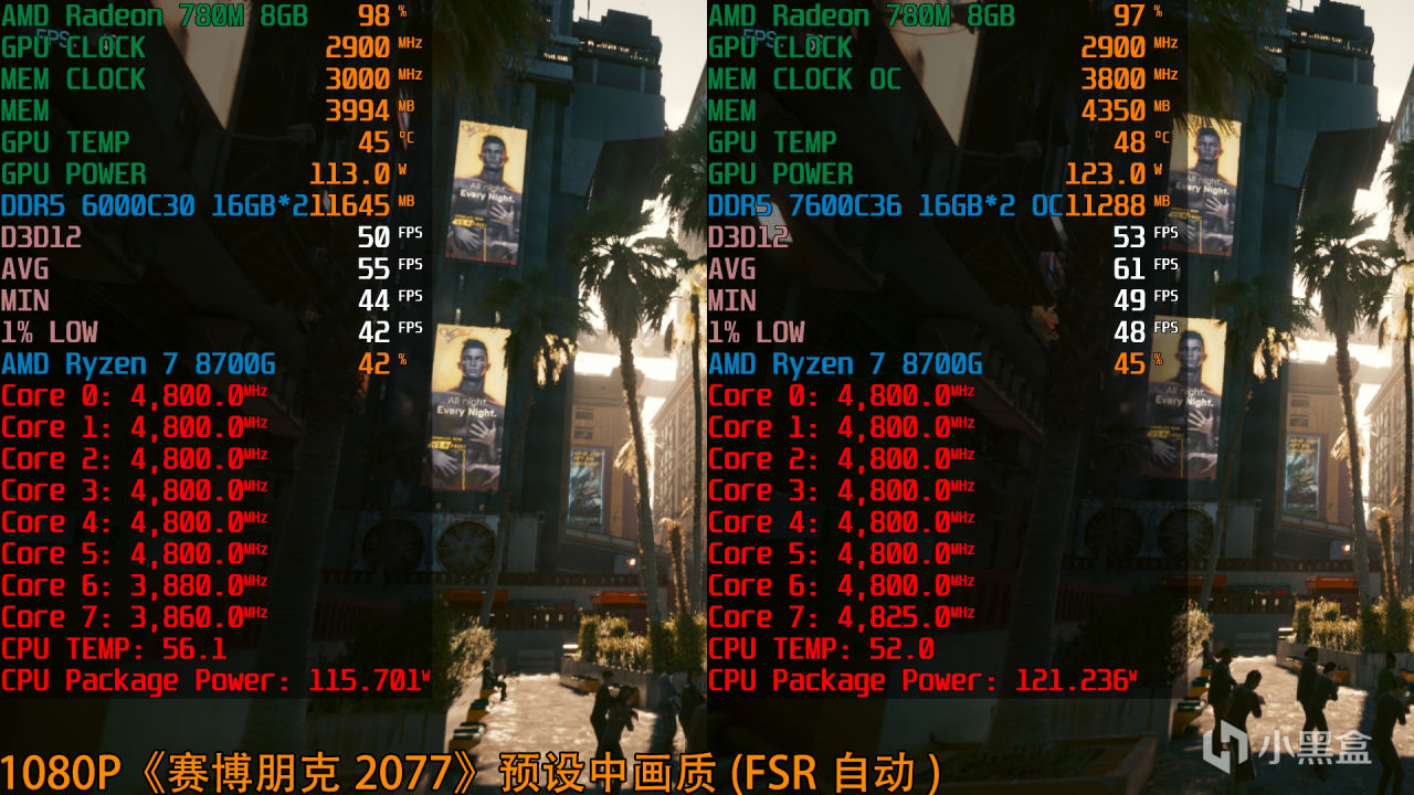 銳龍7 8700G(Radeon 780M)+DDR5 6000C30 1:1平均幀數55fps