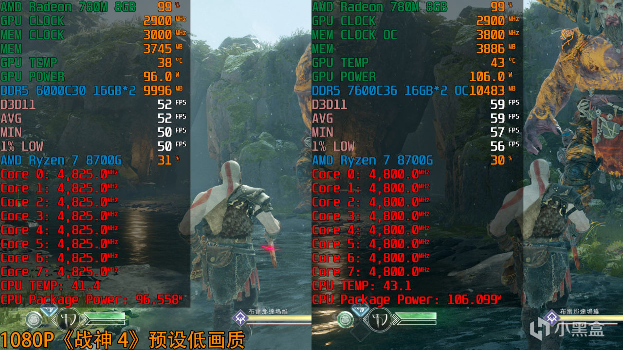 銳龍7 8700G(Radeon 780M)+DDR5 6000C30 1:1平均幀數52fps