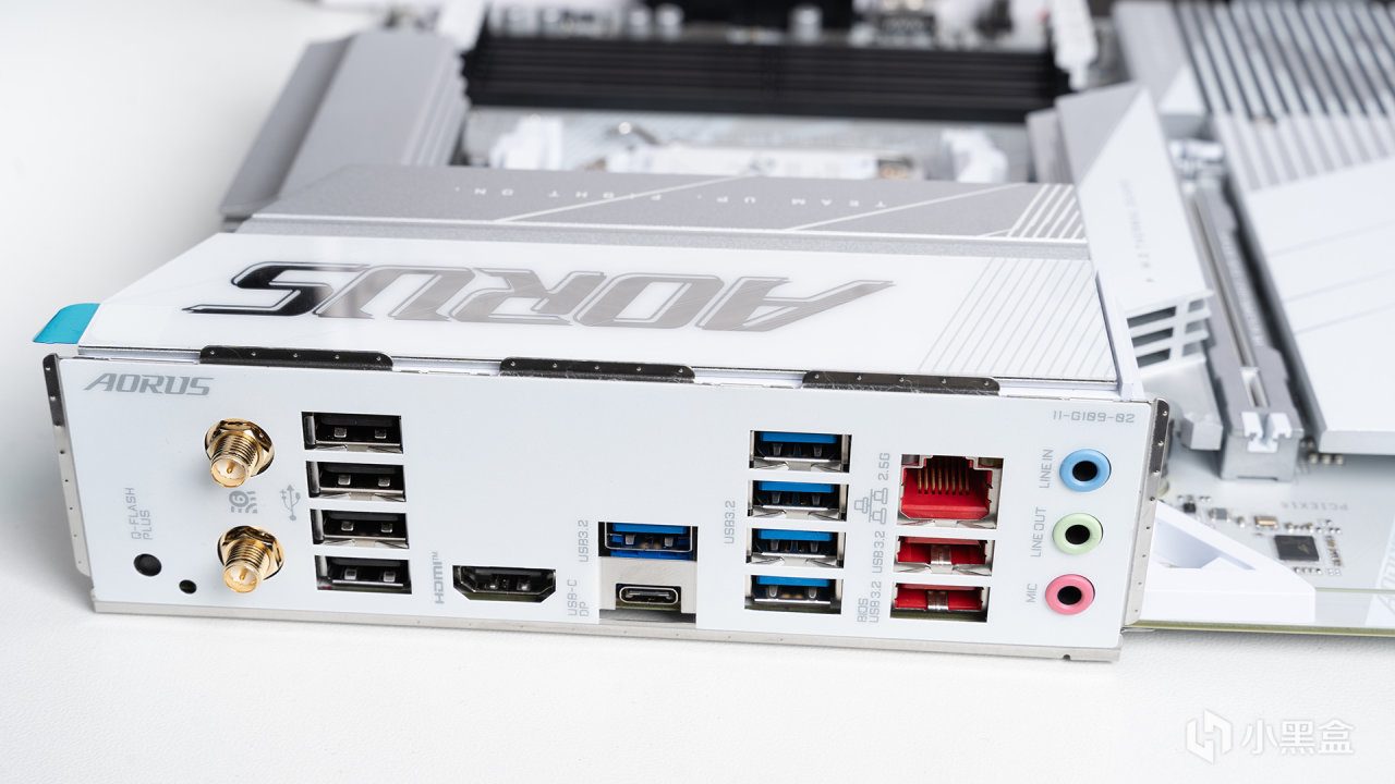B650E冰雕X的I/O接口一覽,擁有Q-Flash Plus按鈕、4*USB 2.0、Wi-Fi 6E無線網絡、1*HDMI 2.0、1*USB Type-C、2*USB 3.2 GEN 2 Type-A(紅色)、5* USB 3.2 GEN 1 Type-A(藍色)、2.5G網口以及三組音頻接口這些配置。首先它多達12個USB接口足夠讓99%的玩家滿足,其次這款搭配銳龍8000G系列處理器時,也可以讓這個USB Type-C滿血達到40Gbps速率,對於經常有大容量數據傳輸的用戶來說簡直就是福音般的存在了。