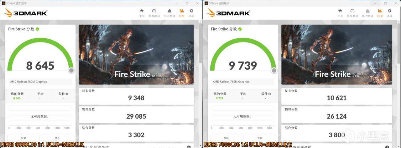 銳龍7 8700G(Radeon 780M)+DDR5 7600C36 1:2 Fire Strike得分爲10621,相比前者提升14%
