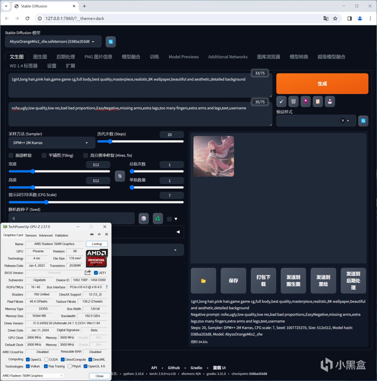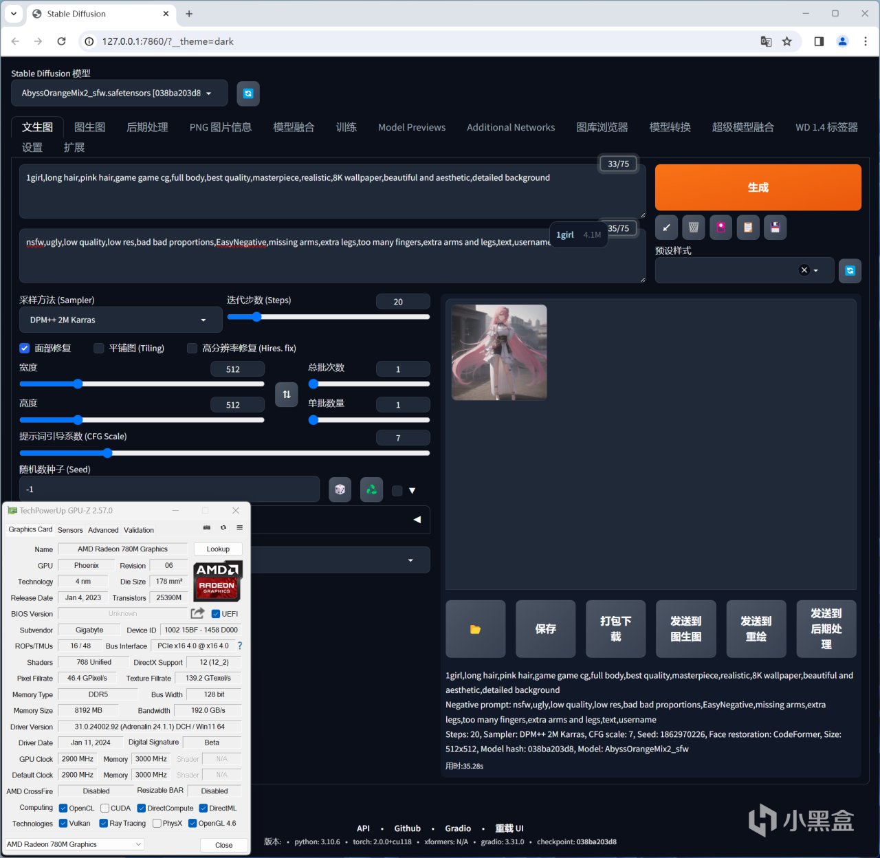 Radeon 780M除了可以玩遊戲以外,它還能跑Stable diffusion AI繪畫,而且效率還算過得去,在DirectML部署加速下,默認512X512分辨率下出一張圖只要35秒左右,性能並不比一些入門級的千元獨顯差,你不妨仔細看一下這款最強核顯的GPU-Z規格就知道原因了。