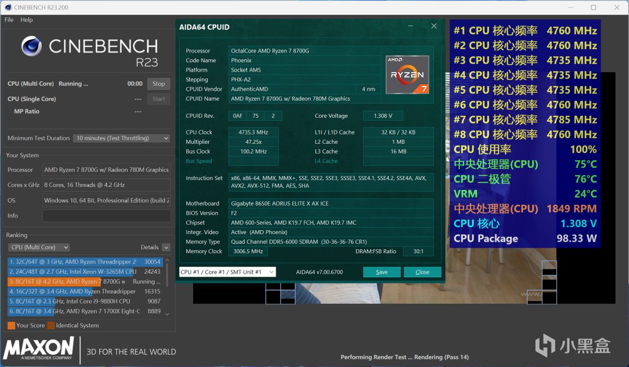 接下來是常規的散熱和功耗測試,這次使用的最強單塔風冷壓制(後續環節有提到型號),通過10分鐘CINBENC R23多核項目烤機後,核心電壓爲1.3V左右,銳龍7 8700G的CPU二極管溫度穩定在最高76℃,相比原裝散熱器要好不少的,CPU功耗爲98W,此時CPU風扇還沒有達到滿轉狀態。