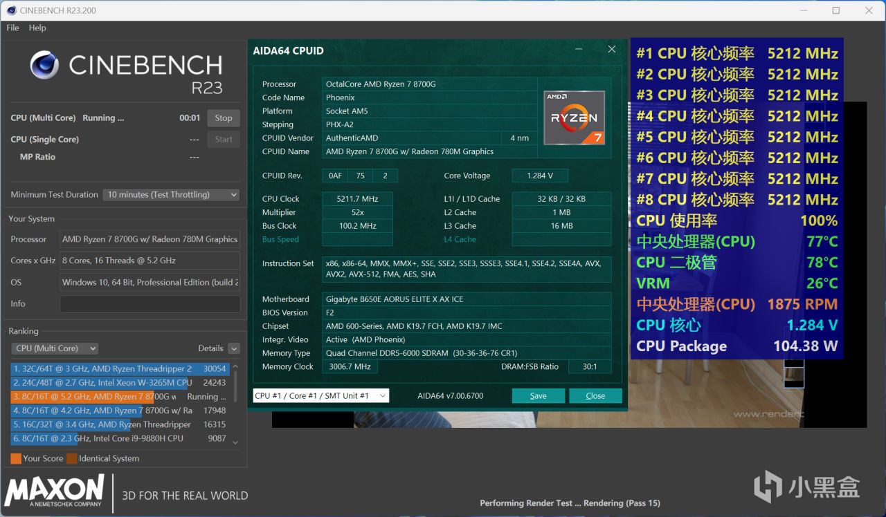 銳龍7 8700G超頻到全核5.2GHz後的烤機表現,由於電壓優化到1.28V左右,CPU二極管溫度最高也只有78℃,CPU功耗爲104W,潛力還算不錯的,功耗和溫度還能保持原有的水平。
